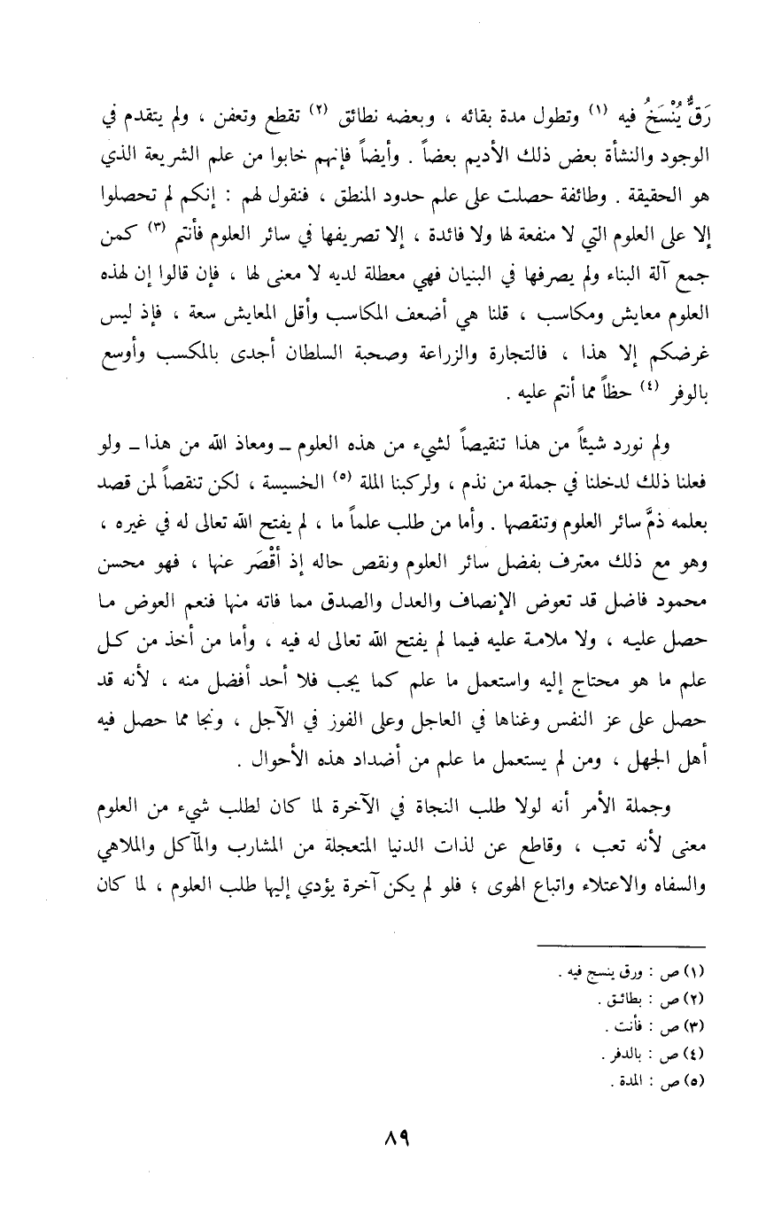 رق ينسخ فيه (1) وتطول مدة بقاءه، وبعضه نطائق (2) تقطع وتعفن، ولم يتقدم في الوجود والنشأة بعض ذلك الأديم بعضاً. وأيضاً فإنهم خابوا من علم الشريعة الذي هو الحقيقة. وطائفة حصلت على علم حدود المنطق، فنقول لهم: إنكم لم تحصلوا إلا على العلوم التي لا منفعة لها ولا فائدة، إلا تصريفها في سائر فأنتم (3) كمن جمع آلة البناء ولم يصرفها في البنيان فهي معطلة لديه لا معنى لها، فإن قالوا إن لهذه العلوم معايش ومكاسب، قلنا هي أضعف المكاسب وأقل المعايش سعة، فإذ ليس غرضكم إلا هذا، فالتجارة والزراعة وصحبة السلطان أجدى بالمكسب وأوسع بالوفر (4) حظاً مما أنتم عليه.
