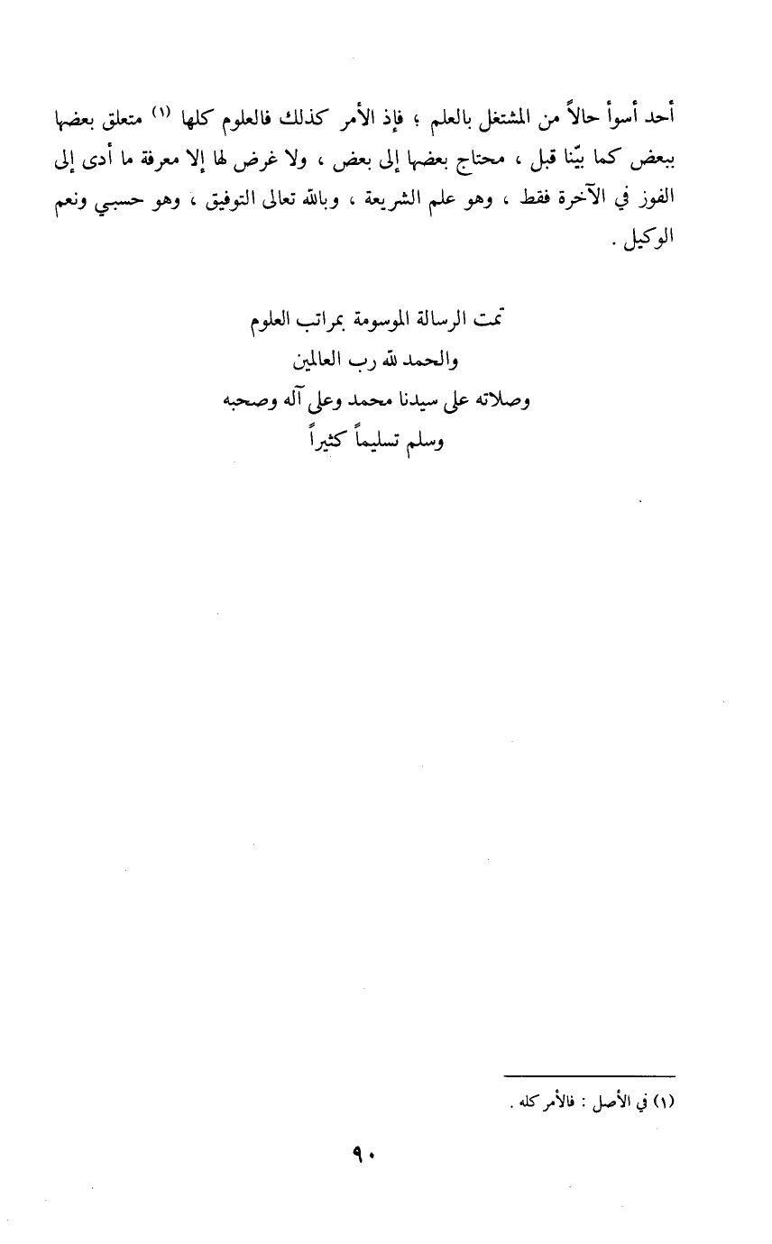 أحد أسوأ حالاً من المشتغل بالعلم؛ فإذ الأمر كذلك فالعلوم كلها (1) متعلق بعضها ببعض كما بينا قبل، محتاج بعضها إلى بعض، ولا غرض لها إلا معرفة ما أدى إلى الفوز في الآخرة فقط، وهو علم الشريعة، وبالله تعالى التوفيق، وهو حسبي ونعم الوكيل.