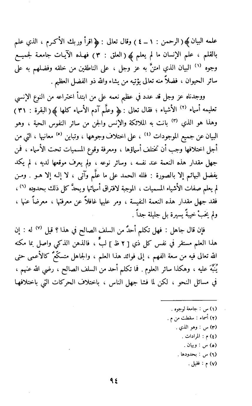 علمه البيان} (الرحمن: 1 4) وقال تعالى {اقرأ وربك الأكرم، الذي علم بالقلم، علم الإنسان ما لم يعلم} (العلق: 3) فهذه الآيات جامعة لجميع وجوه (1) البيان الذي امتن به عز وجل، على الناطقين من خلقه وفضلهم به على سائر الحيوان، فضلاً منه تعالى يؤتيه من يشاء والله ذو الفضل العظيم.