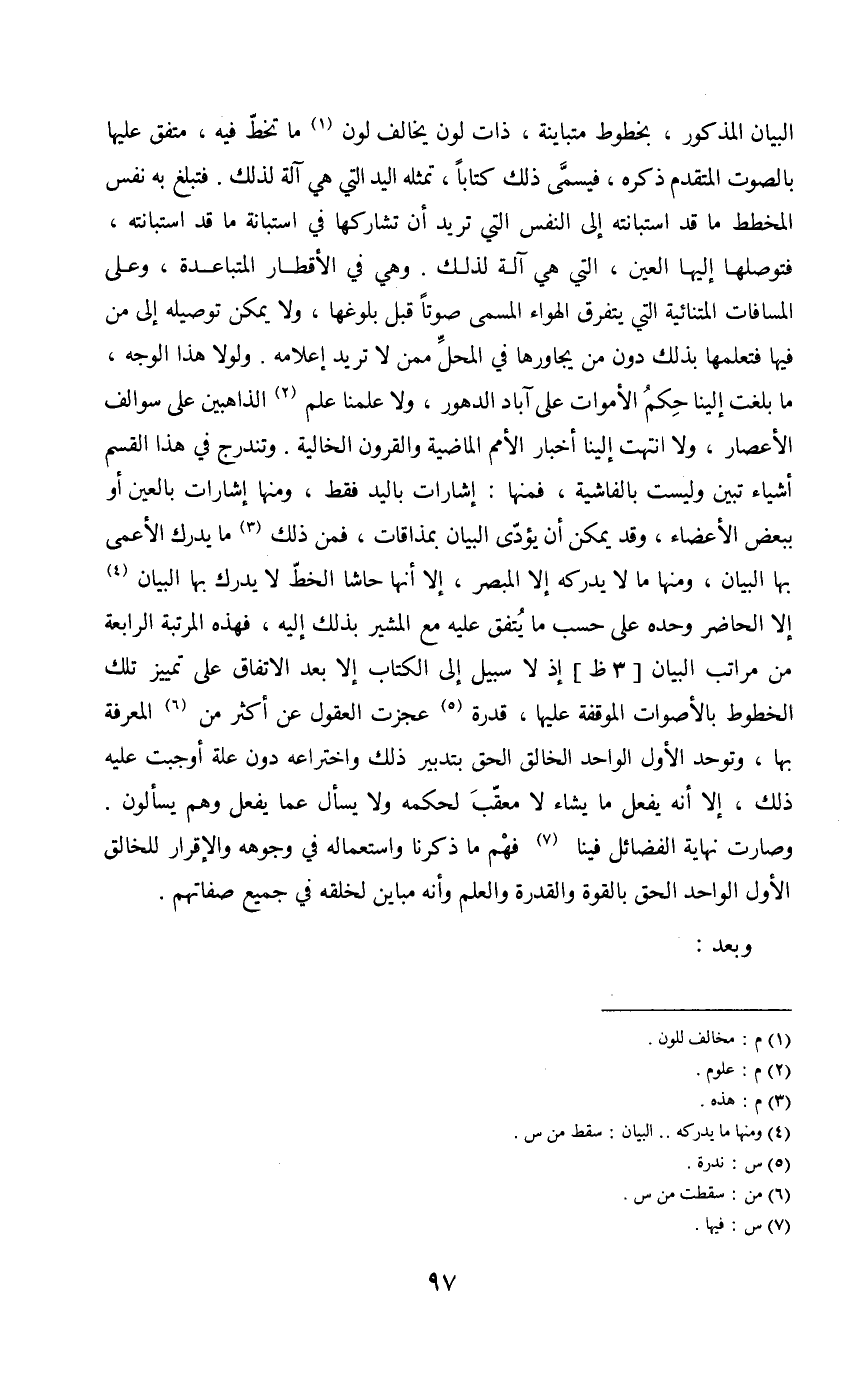 البيان المذكور، بخطوط متباينة، ذات لون يخالف لون (1) ما تخط فيه، متفق عليها بالصوت المتقدم ذكره، فيسمى ذلك كتاباً تمثله اليد التي هي آلة لذلك. فتبلغ به نفس المخطط ما قد استبانته إلى النفس التي تريد أن تشاركها في استبانة ما قد استبانته، فتوصلها إليها العين، التي هي آلة لذلك. وهي في الأقطار المتباعدة، وعلى المسافات المتنائية التي يتفرق الهواء المسمى صوتاً قبل بلوغها، ولا يمكن توصيله إلى من فيها فتعلمها بذلك دون من يجاورها في المحل ممن لا تريد إعلامه. ولولا هذا الوجه، ما بلغت إلينا حكم الأموات على آباد الدهور، ولا علمنا علم (2) الذاهبين على سوالف الأعصار، ولا انتهت إلينا أخبار الأمم الماضية والقرون الخالية. وتندرج في هذا القسم أشياء وليست بالفاشية، فمنها: إشارات باليد فقط، ومنها إشارات بالعين أو ببعض الأعضاء، وقد يمكن أن يؤدي البيان بمذاقات، فمن ذلك (3) ما يدرك الأعمى بها البيان، ومنها ما لا يدركه إلا المبصر، إلا أنها حاشا الخط لا يدرك بها البيان (4) إلا الحاضر وحده على حسب ما يتفق عليه مع المشير بذلك إليه، فهذه المرتبة الرابعة من مراتب البيان [3 ظ] إذ لا سبيل إلى الكتاب إلا بعد الاتفاق على تمييز تلك الخطوط بالأصوات الموقفة عليها، قدرة (5) عجزت العقول عن أكثر من (6) المعرفة بها، وتوحد الأول الواحد الخالق الحق بتدبير ذلك واختراعه دون علة أوجبت عليه ذلك، إلا أنه يفعل ما يشاء لا معقب لحكمه ولا يسأل عما يفعل وهم يسألون. وصارت نهاية الفضائل فينا (7) فهم ما ذكرنا واستعمال في وجوهه والإقرار للخالق الأول الواحد الحق بالقوة والقدرة والعلم وأنه مباين لخلقه في جميع صفاتهم.