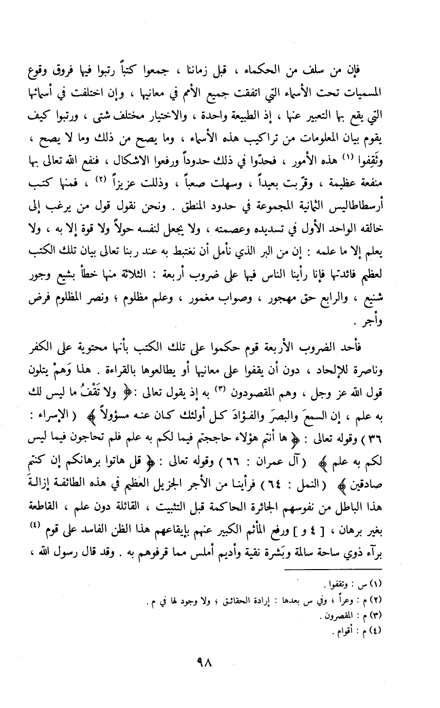 فأحد الضروب الأربعة قوم حكموا على تلك الكتب بأنها محتوية على الكفر للإلحاد، دون أن يقفوا على معانيها أو يطالعوها بالقراءة. هذا وهم يتلون قول الله عز وجل، وهم المقصودون (3) به إذ يقول تعالى: {ولا تقف ما ليس لك به علم، إن السمع والبصر والفؤاد كل أولئك كان عنه مسؤولاً} (الإسراء: 36) وقوله تعالى: {ها أنتم هؤلاء حاجتهم فيما لكم به علم فلم تحاجون فيما ليس لكم به علم} (آل عمران: 66) وقوله تعالى: {قل هل هاتوا برهانكم إن كنتم صادقين} (النمل: 64) فرأينا من الأجر الجزيل العظيم في هذه الطائفة إزالة هذا الباطل من نفوسهم الجائرة الحاكمة قبل التثبيت، القائلة دون علم، القاطعة بغير برهان، [4 و] ورفع المأثم الكبير عنهم بإيقاعهم هذا الظن الفاسد على قوم (4) برآء ذوي ساحة سالمة وبشرة نقية وأديم أملس مما قرفوهم به. وقد قال رسول الله،