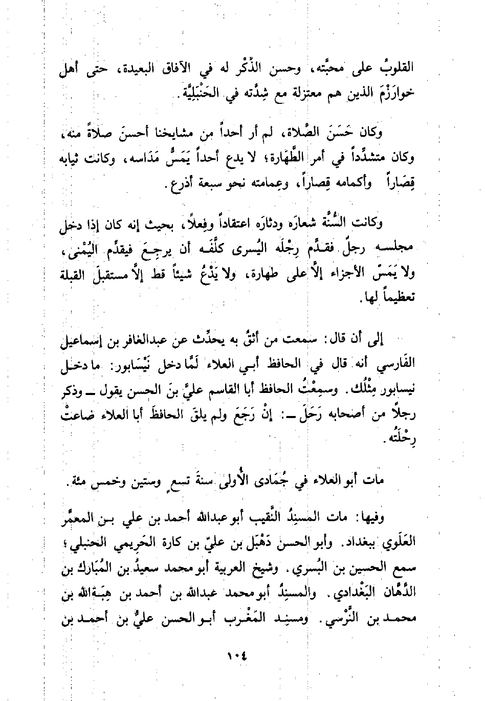 وكان حَسَنَ الصَّلاة، لم أر أحدًا من مشايخنا أحسنَ صلاةً منه، وكان متشدِّدًا في أمر الطَّهَارة؛ لا يدع أحدًا يَمَسُّ مَدَاسه، وكانت ثيابه قِصَارًا وأكمامه قِصارًا، وعِمامته نحو سبعة أذرع.