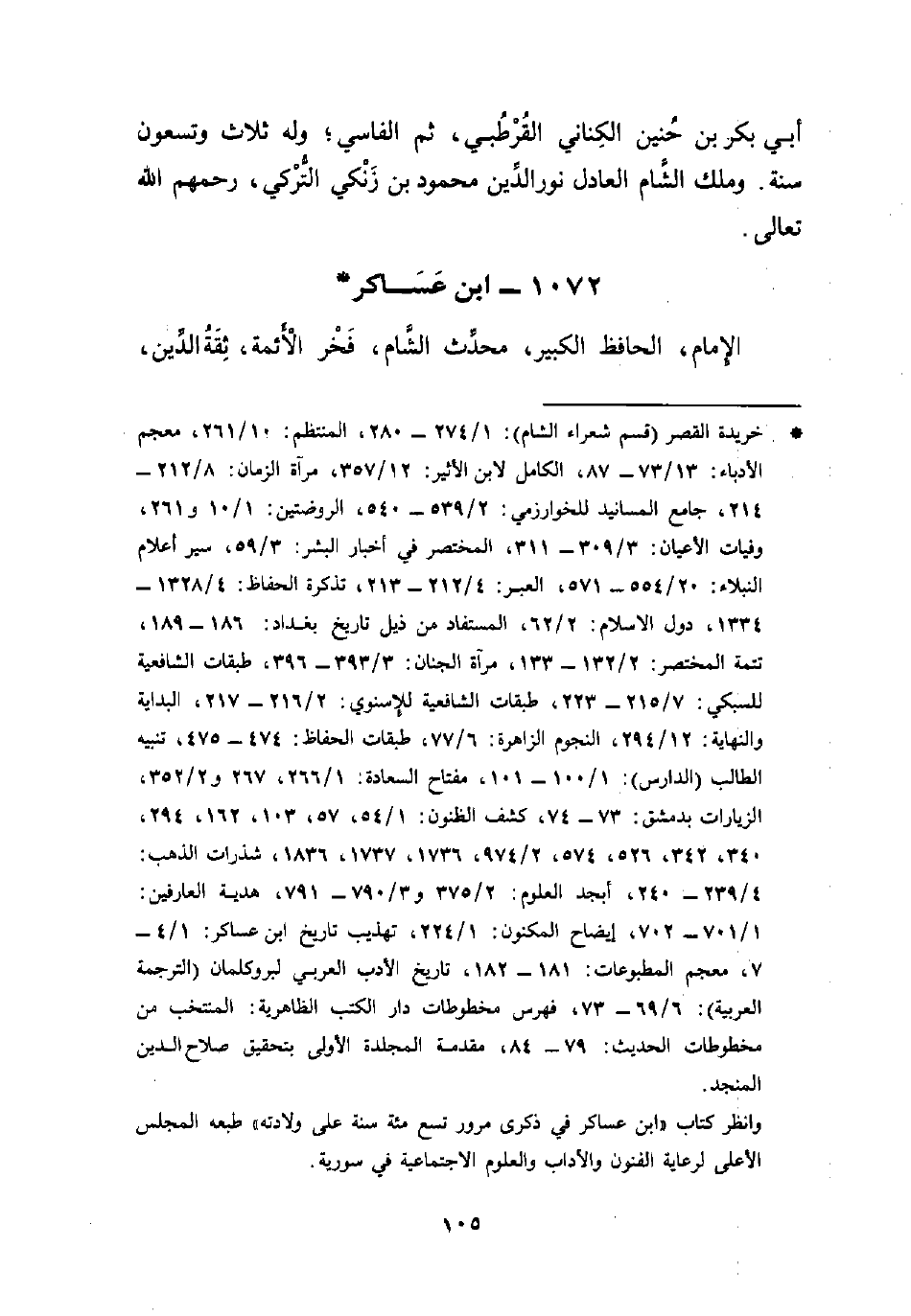 وانظر كتاب "ابن عساكر في ذكرى مرور تسع مئة سنة على ولادته" طبعه المجلس الأعلى لرعاية الفنون والأداب والعلوم الاجتماعية في سورية.