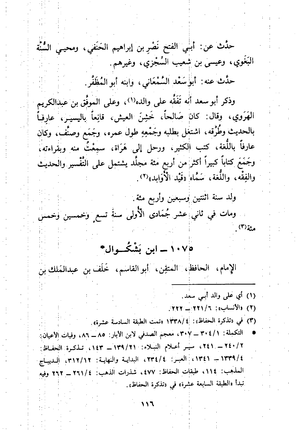 وذكر أبو سعد أنه تَفَقَّه على والده (¬1)، وعلى الموفق بن عبد الكريم الهَرَوي، وقال: كان صَالحًا، خَشِنَ العيش، قانِعًا باليسير، عارفًا بالحديث وطُرُقه، اشتغل بطلبه وجَمْعِهِ طول عمره، وجَمَع وصنَّف، وكان عارفًا باللُّغة، كتب الكثير، ورحل إلى هَرَاة، سمِعْتُ منه وبقراءته، وجَمَعَ كتابًا كبيرًا أكثر من أربع مئة مجلَّد يشتمل على التَّفْسير والحديث والفِقْه، واللُّغة، سَمَّاه "قَيد الْأَوَابد" (¬2).