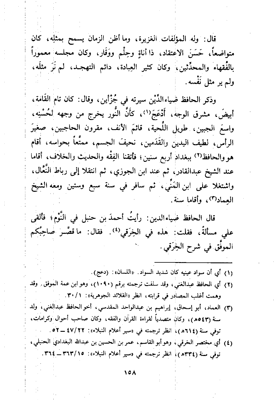 وذكر الحافظ ضياء الدِّين سيرته في جُزْأين، وقال: كان تام القَامة، أبيضَ، مشرق الوجه، أَدْعَجَ (¬1)، كانَّ النُّور يخرج من وجهه لحُسْنِه، واسعَ الجبين، طويل اللِّحية، قائمَ الأنف، مقرون الحاجبين، صغيرَ الرأس، لطيف اليدين والقَدَمين، نحيفَ الجسم، ممتَّعًا بحواسه، أقام هو والحافظ (¬2) ببغداد أربع سنين؛ فأتقنا الفِقْه والحديث والخلاف، أقاما عند الشيخ عبد القادر، ثم عند ابن الجوزي، ثم انتقلا إلى رباط النَّعَّال، واشتغلا على ابن المَنِّي، ثم سافر في سنة سبع وستين ومعه الشيخ العِماد (¬3)، وأقاما سنة.