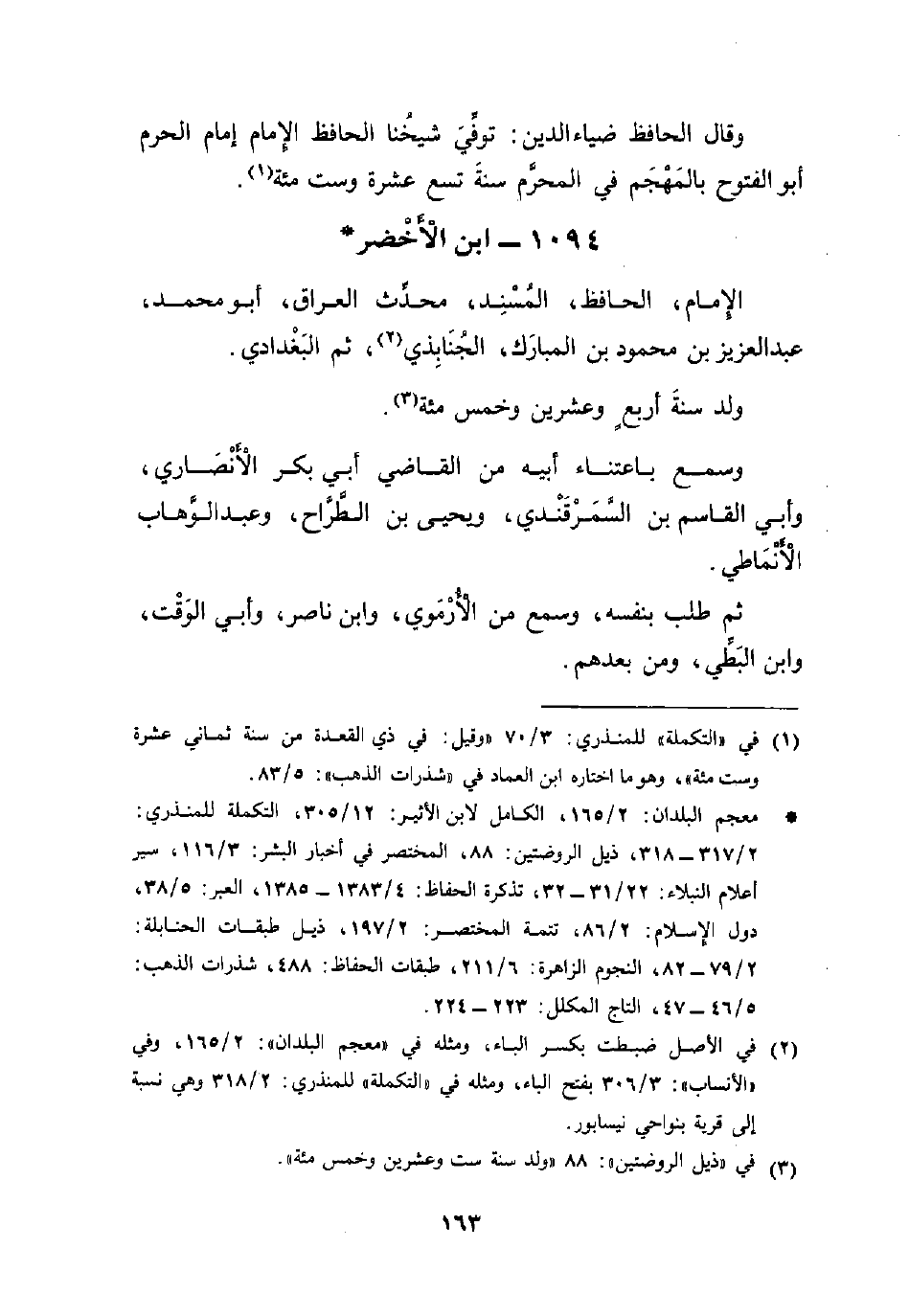 الإِمام، الحافظ، المُسْنِد، محدِّث العراق، أبو محمد، عبد العزيز بن محمود بن المبارَك، الجُنابِذي (¬2)، ثم البَغْدادي.