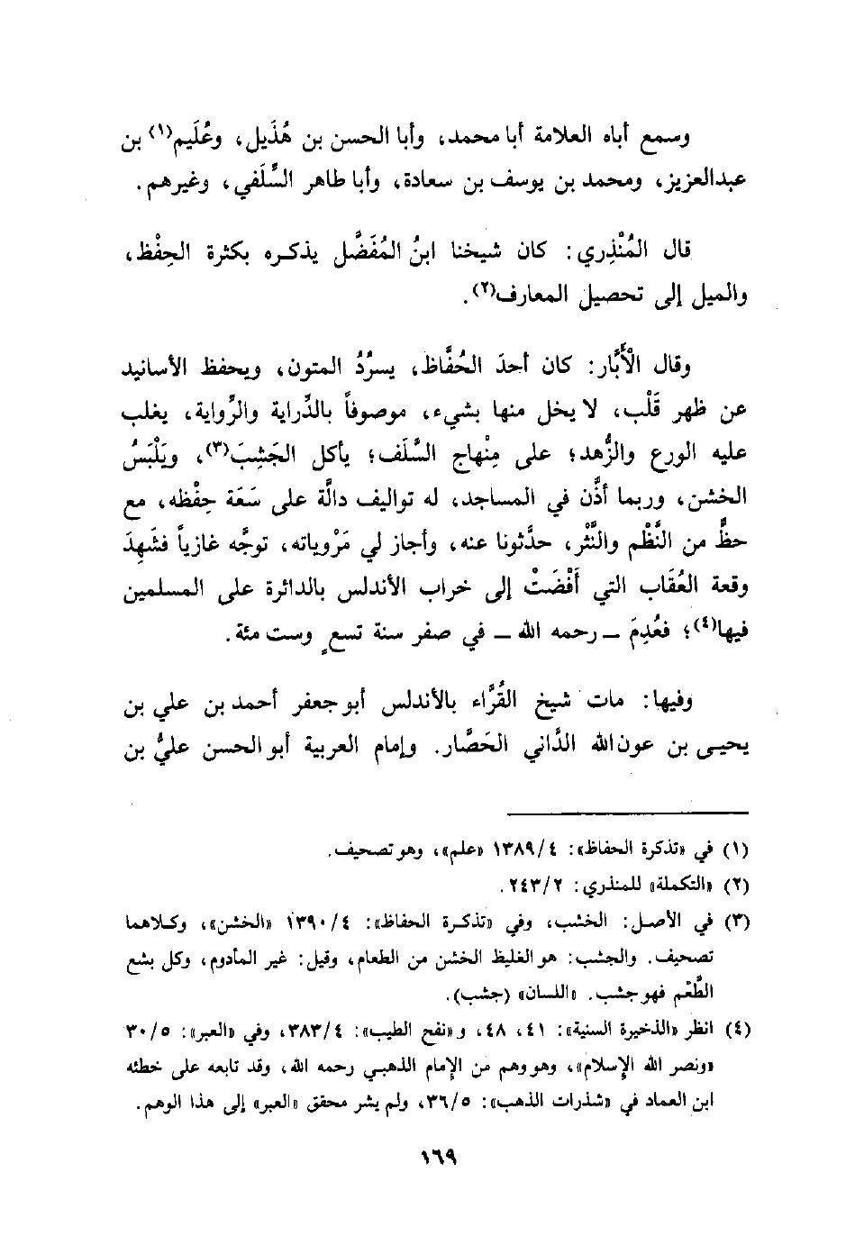 وقال الْأَبَّار: كان أحدَ الحُفَّاظ، يسرُدُ المتون، ويحفظ الأسانيد عن ظهر قَلْب، لا يخل منها شيء، موصوفًا بالدِّراية والرِّواية، يغلب عليه الورع والزُّهد؛ على مِنْهاج السَّلَف؛ يأكل الجَشِبَ (¬3)، ويَلْبَسُ الخشن، وربما أذَّن في المساجد، له تواليف دالَّة على سَعَة حِفْظه، مع حظَّ من النَّظْم والنَّثْر، حدَّثونا عنه، وأجاز لي مَرْوياته، توجَّه غازيًا فشهِدَ وقعة العُقَاب التي أَفْضَتْ إلى خراب الأندلس بالدائرة على المسلمين فيها (¬4)؛ فعُدِمَ -رحمه الله- في صفر سنة تسعٍ وست مئة.