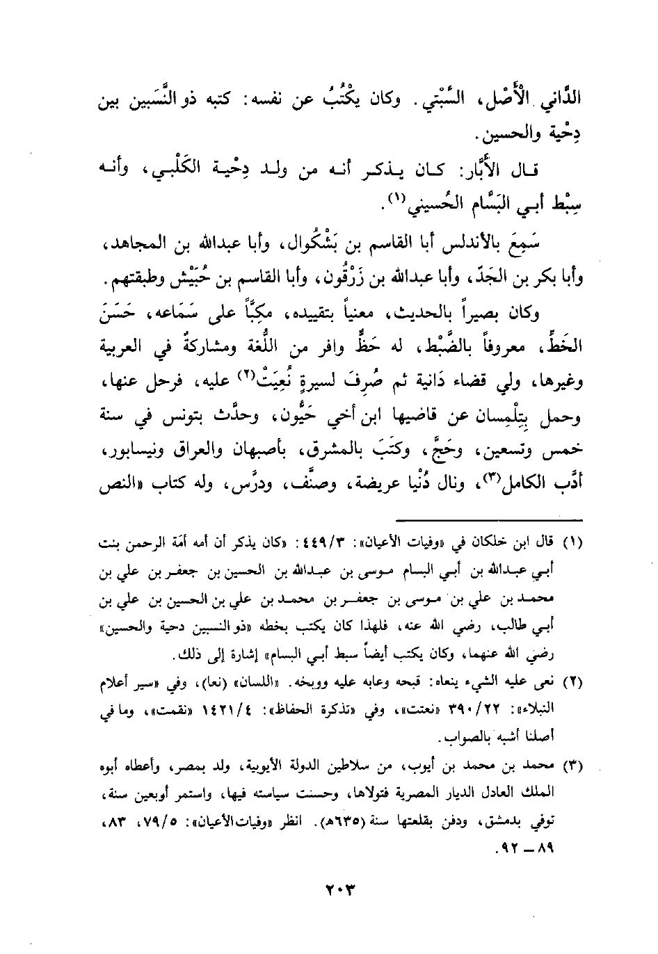 (¬1) قال ابن خلكان في "وفيات الأعيان": 3/ 449: "كان يذكر أن أمه أمَة الرحمن بنت أبي عبد الله بن أبي البسام موسى بن عبد الله بن الحسين بن جعفر بن علي بن محمد بن علي بن موسى بن جعفر بن محمد بن علي بن الحسين بن علي بن أبي طالب، رضي الله عنه، فلهذا كان يكتب بخطه "ذو النسبين دحية والحسين" رضي الله عنهما، وكان يكتب أيضًا سبط أبي البسام" إشارة إلى ذلك.