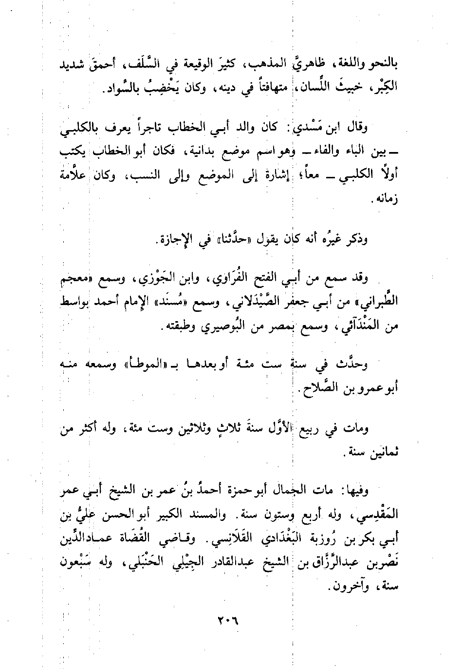 وقال ابن مَسْدي: كان والد أبي الخطاب تاجرًا يعرف بالكلبي -بين الباء والفاء- وهو اسم موضع بدانية، فكان أبو الخطاب يكتب أولًا الكلبي- معًا؛ إشارة إلى الموضع وإلى النسب، وكان علَّامة زمانه.