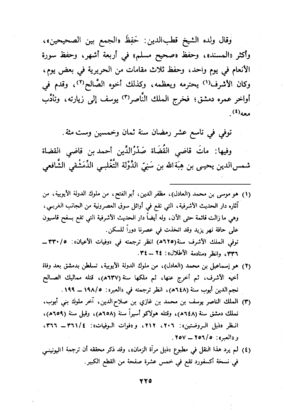 وقال ولده الشيخ قطب الدين: حَفِظ "الجمع بين الصحيحين"، وأكثر "المسند"، وحفظ "صحيح مسلم" في أربعة أشهر، وحفظ سورة الأنعام في يوم واحد، وحفظ ثلاث مقامات من الحريرية في بعض يوم، وكان الأشرف (¬1) يحترمه ويعظمه، وكذلك أخوه الصَّالح (¬2)، وقدم في أواخر عمره دمشق: فخرج الملك النَّاصر (¬3) يوسف إلى زيارته، وتأدَّب معه (¬4).