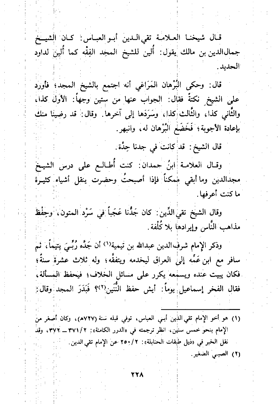 وذكر الإمام شرف الدين عبد الله بن تيمية (¬1) أن جَده رُبِّيَ يتيمًا، ثم سافر مع ابن عَمه إلى العراق ليخدمه ويتفقَّه: وله ثلاث عشرة سنةً: فكان يبيت عنده ويسمعه يكرر على مسائل الخلاف: فيحفظ المسألة، فقال الفخر إسماعيل يومًا: أيش حفظ النُّنَين (¬2)؟ فَبَدَرَ المجد وقال: