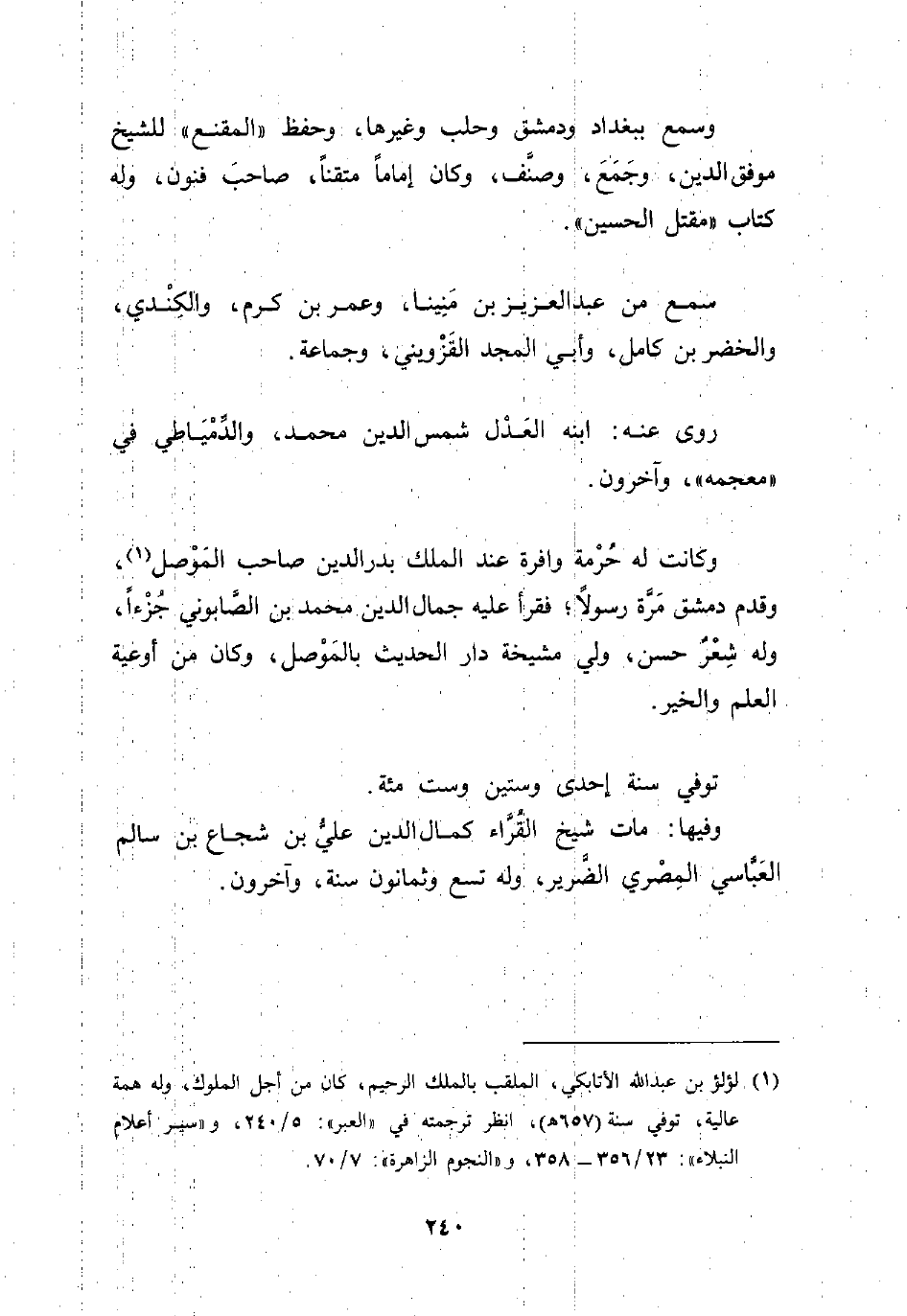 (¬1) لؤلؤ بن عبد الله الأتابكي، الملقب بالملك الرحيم، كان من أجل الملوك، وله همة عالية، توفي سنة (657 هـ)، انظر ترجمته في "العبر": 5/ 240، و"سير أعلام النبلاء": 23/ 356 - 358، و"النجوم الزاهرة": 7/ 70.