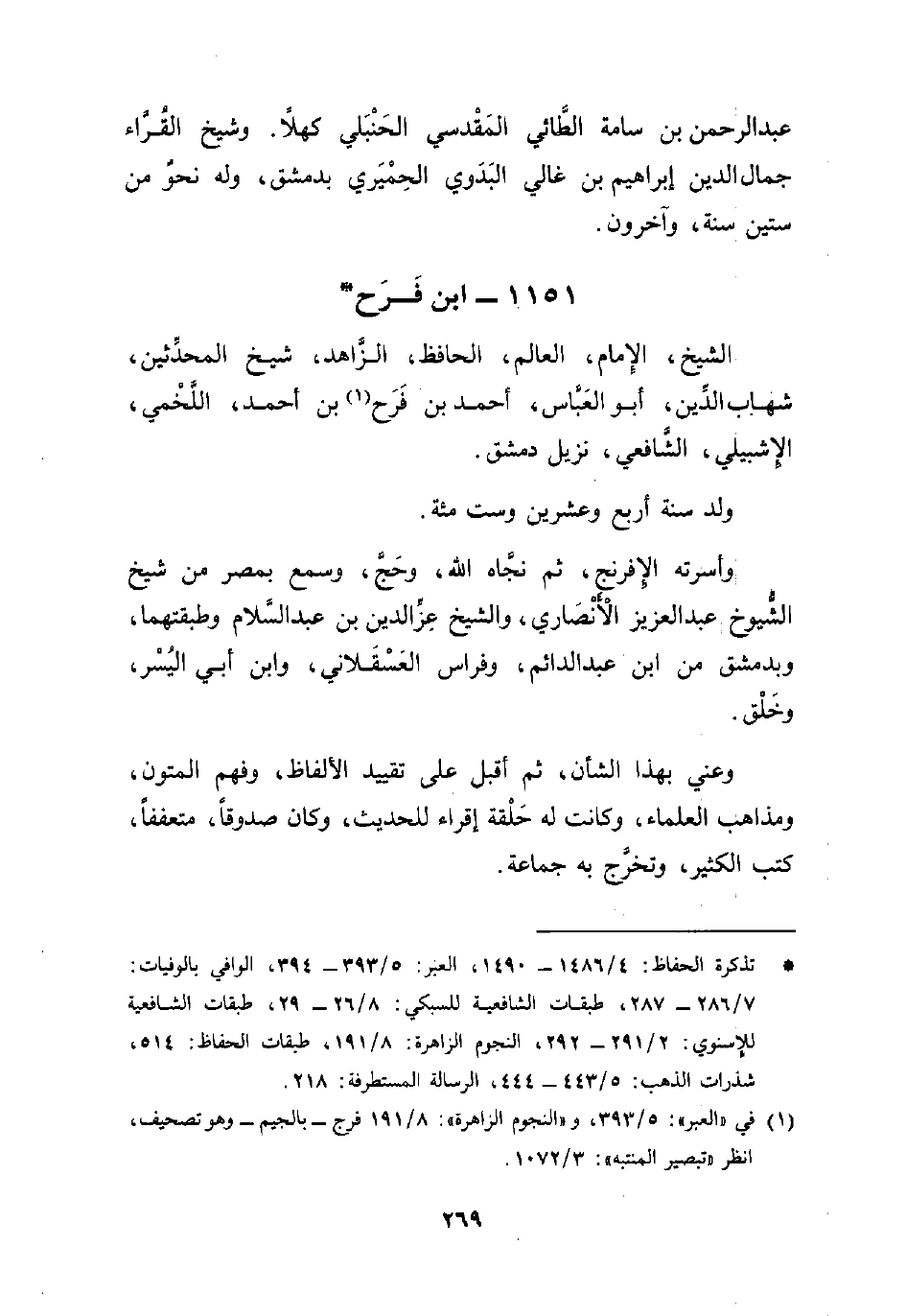 الشيخ، الإِمام، العالم، الحافظ، الزَّاهد، شيخ المحدِّثين، شهاب الدِّين، أبو العَبَّاس، أحمد بن فَرَح (¬1) بن أحمد، اللَّخْمي، الإِشبيلي، الشَّافعي، نزيل دمشق.