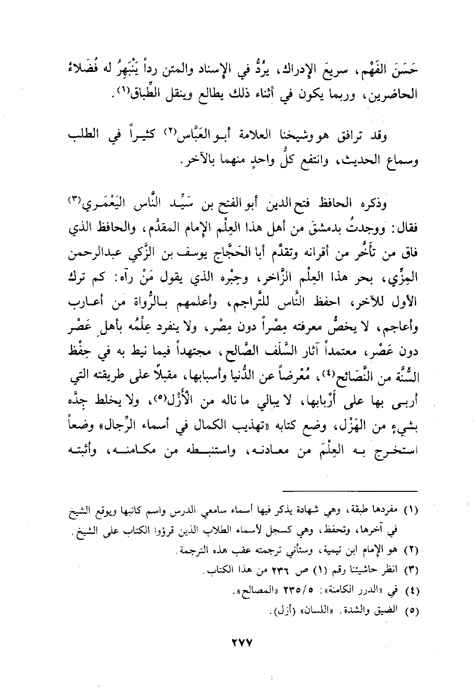 وذكره الحافظ فتح الدين أبو الفتح بن سَيِّد النّاس اليَعْمَري (¬3) فقال: ووجدتُ بدمشقَ من أهل هذا العِلْم الإِمام المقدَّم، والحافظ الذي فاق من تأَخَّر من أقرانه وتقدم أبا الحَجَّاج يوسف بن الزَّكي عبد الرحمن المِزِّي، بحر هذا العِلْم الزَّاخر، وحِبْره الذي يقول مَنْ رآه: كم ترك الأول للآخر، احفظ النَّاس للتَّراجم، وأعلمهم بالرُّواة من أعارب وأعاجم، لا يخصُّ معرفته مِصْرًا دون مِصْر، ولا ينفرد عِلْمُه بأهلِ عَصْر دون عَصْر، معتمدًا آثار السَّلف الصَّالح، مجتهدًا فيما نيط به في حِفْظ السُّنَّة من النَّصَائح (¬4)، مُعْرضًا عن الدُّنيا وأسبابها، مقبلًا على طريقته التي أربى بها على أَرْبابها، لا يبالي ما ناله من الْأَزْل (¬5)، ولا يخلط جِدَّه بشيءٍ من الهَزْل، وضع كتابه "تهذيب الكمال في أسماء الرِّجال" وضعًا استخرج به العِلْمَ من معادنه، واستنبطه من مكامنه، وأثبته