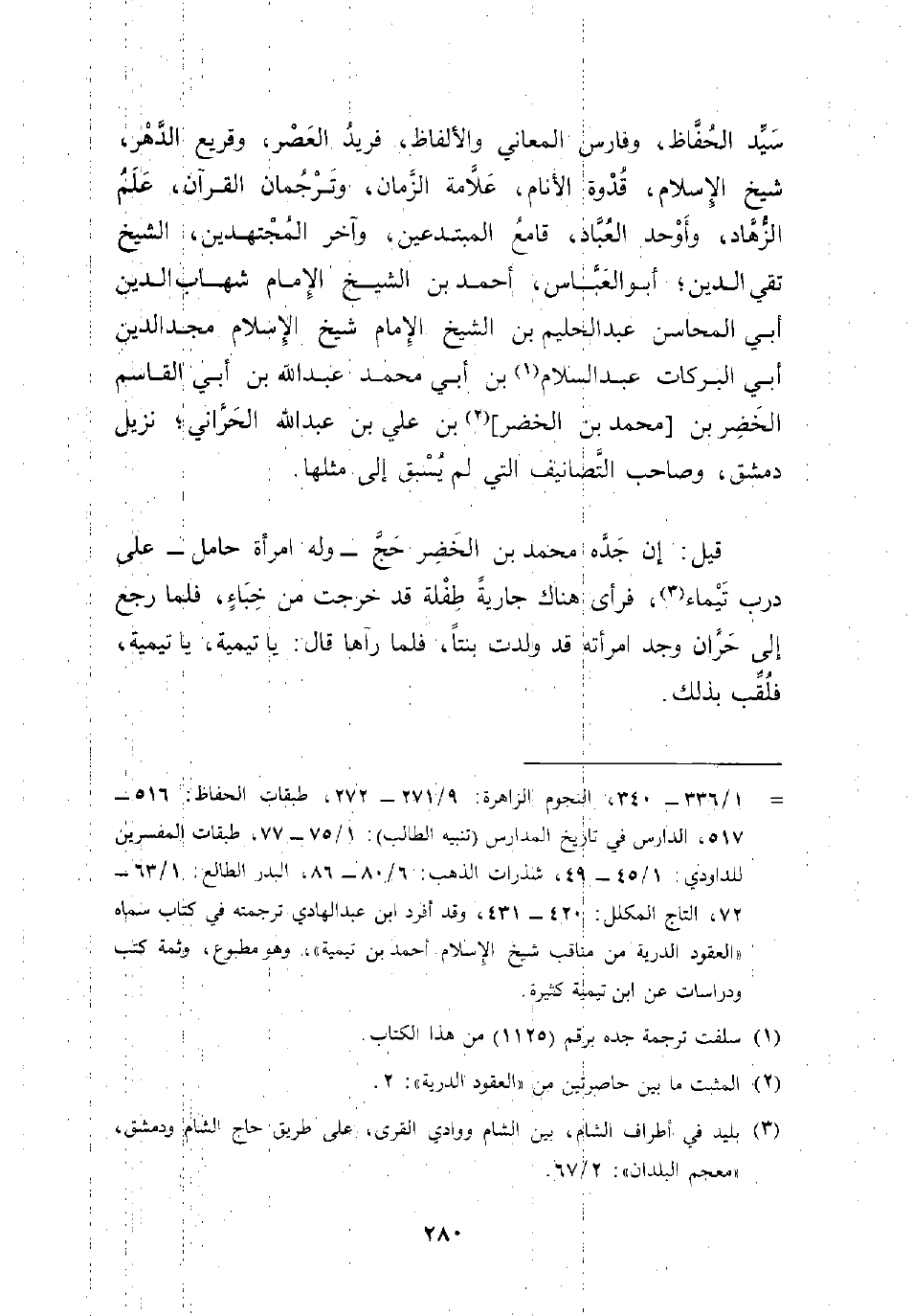 سَيِّد الحُفَّاظ، وفارس المعاني والألفاظ، فريدُ العَصْر، وقريع الدَّهْر، شيخ الإِسلام، قُدْوة الأنام، عَلَّامة الزَّمان، وتَرْجُمان القرآن، عَلَمُ الزُّهَّاد، وأَوْحد العُبَّاد، قامعُ المبتدعين، وآخر المُجْتهدين، الشيخ تقي الدين؛ أبو العَبَّاس، أحمد بن الشيخ الإِمام شهاب الدين أبي المحاسن عبد الحليم بن الشيخ الإِمام شيخ الإِسلام مجد الدين أبي البركات عبد السلام (¬1) بن أبي محمد عبد الله بن أبي القاسم الخَضِر بن [محمد بن الخضر] (¬2) بن علي بن عبد الله الحَرَّاني؛ نزيل دمشق، وصاحب التَّصانيف التي لم يُسْبق إلى مثلها.