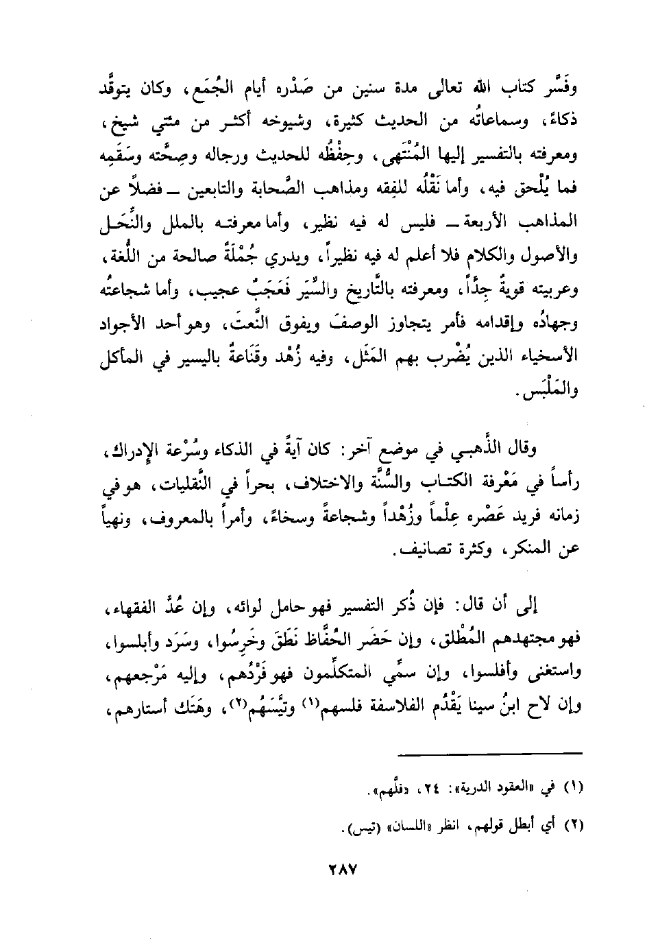 إلى أن قال: فإن ذُكر التفسير فهو حامل لوائه، وإن عُدَّ الفقهاء، فهو مجتهدهم المُطْلق، وإن حَضَر الحُفَّاظ نَطَقَ وخَرِسُوا، وسَرَد وأبلسوا، واستغنى وأفلسوا، وإن سمِّي المتكلِّمون فهو فَرْدُهم، وإليه مَرْجعهم، وإن لاح ابنُ سينا يَقْدُم الفلاسفة فلسهم (¬1) وتيَّسَهُم (¬2)، وهَتَك أستارهم،