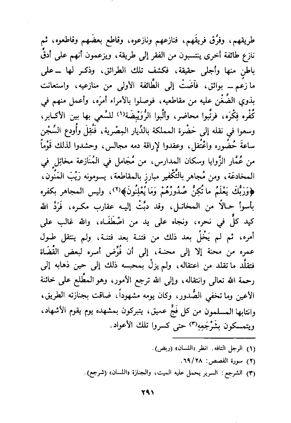 طريقهم، وفرَّق فريقَهم، فنازعهم ونازعوه، وقاطع بعضَهم وقاطعوه، ثم نازع طائفة أخرى ينتسبون من الفقر إلى طريقة، ويزعمون أنهم على أدقِّ باطنٍ منها وأجلى حقيقة، فكشف تلك الطرائق، وذكر لها -على ما زعم- بوائق، فآضَتْ إلى الطَّائفة الأولى من منازعيه، واستعانت بذوي الضِّغْن عليه من مقاطعيه، فوصلوا بالأمراء أمرَه، وأعمل منهم في كُفْره فِكْره، فرتَّبوا محاضر، وألَّبوا الرُّويبِضَة (¬1) للسَّعي بها بين الأكابر، وسعوا في نقله إلى حَضْرة المملكة بالدِّيار المِصْرية، فَنُقِلَ وأُودع السِّجْن ساعةَ حُضُوره واعْتُقل، وعقدوا لإِراقة دمه مجالس، وحشدوا لذلك قَوْمًا من عُمَّار الزَّوايا وسكان المدارس، من مُجَامل في المُنَازعة مخاتِلٍ في المخادعَة، ومن مُجاهر بالتَّكْفير مبارزٍ بالمقاطعة، يسومونه رَيبَ المَنُون، {وَرَبُّكَ يَعْلَمُ مَا تُكِنُّ صُدُورُهُمْ وَمَا يُعْلِنُونَ} (¬2)، وليس المجاهر بكفره بأسوأ حالًا من المخاتل، وقد دبَّتْ إليه عقارب مكره، فَرَدَّ الله كيد كلٍّ في نحره، ونجاه على يد من اصْطَفَاه، والله غالب على أمره، ثم لم يَخْلُ بعد ذلك من فتنة بعد فتنة، ولم ينتقل طول عمره من محنة إلا إلى محنة، إلى أن فُوِّض أمره لبعض القُضَاة فتقلَّد ما تقلد من اعتقاله، ولم يزلْ بمحبسه ذلك إلى حين ذهابه إلى رحمة الله تعالى وانتقاله، وإلى الله ترجع الأمور، وهو المطَّلع على خائنة الأعين وما تخفي الصُّدور، وكان يومه مشهودًا، ضاقت بجنازته الطريق، وانتابها المسلمون من كل فَجٍّ عميق، يتبركون بمشهده يوم يقوم الأشهاد، ويتمسكون بشَرْجَعِهِ (¬3) حتى كسروا تلك الأعواد.