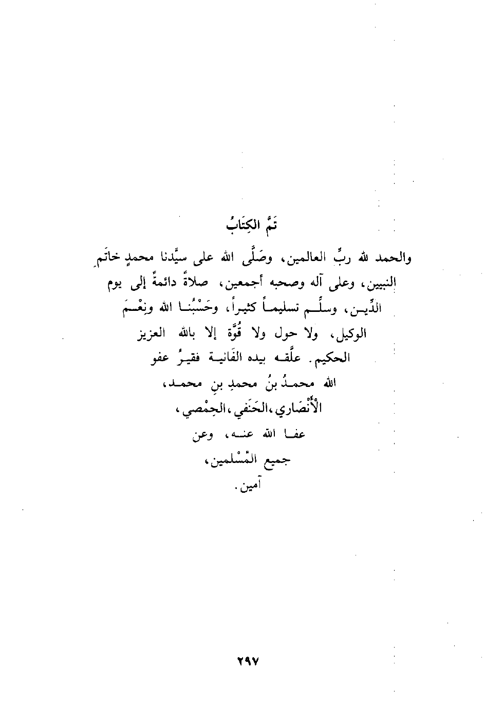 والحمد لله ربِّ العالمين، وصَلَّى الله على سيِّدنا محمدٍ خاتَمِ النبيين، وعلى آله وصحبه أجمعين، صلاةً دائمةً إلى يوم الدِّين، وسلِّم تسليمًا كثيرًا، وحَسْبُنا الله ونِعْمَ الوكيل، ولا حول ولا قُوَّة إلا بالله العزيز الحكيم. علَّقه بيده الفَانية فقيرُ عفو الله محمدُ بن محمدِ بنِ محمد، الأَنْصَاري، الحَنَفي، الحِمْصي، عفا الله عنه، وعن جميع المُسْلمين، آمين.