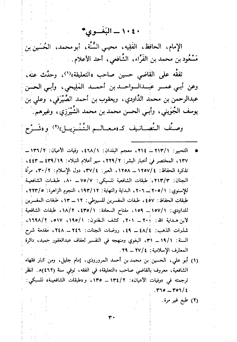 الإمام، الحافظ، الفَقِيه، محيي السُّنَّة، أبو محمد، الحُسَين بن مَسْعُود بن محمد بن الفَرَّاء، الشَّافعي، أحد الأعلام.