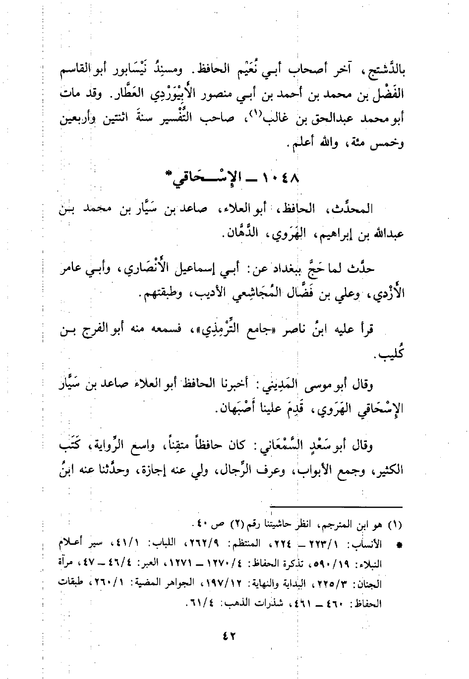 وقال أبو موسى المَدِيني: أخبرنا الحافظ أبو العلاء صاعد بن سَيَّار الإِسْحَاقي الهَرَوي، قَدِمَ علينا أَصْبَهان.
