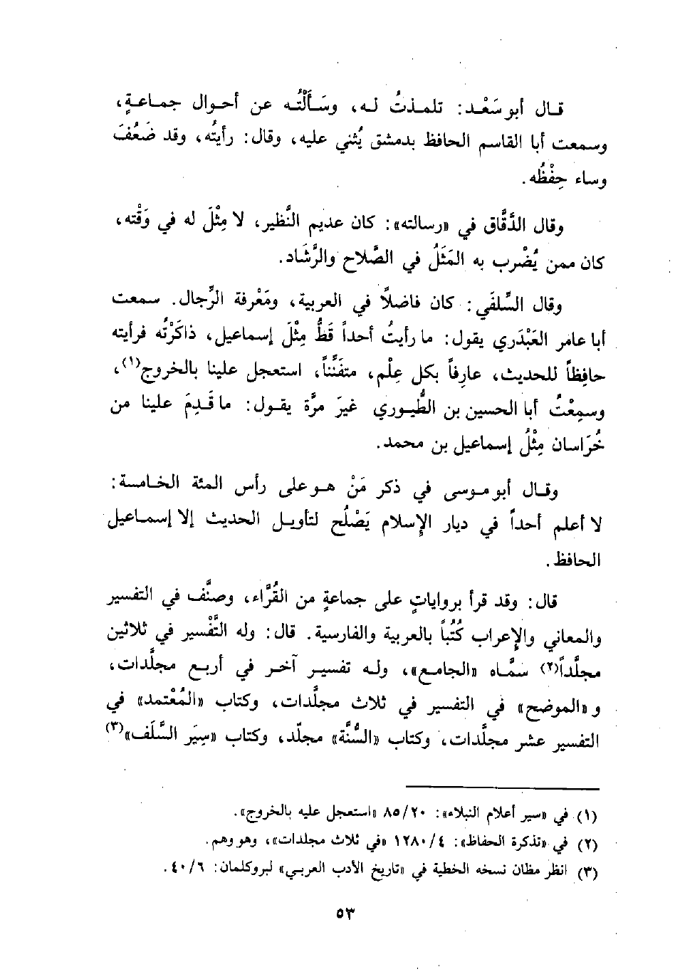 قال: وقد قرأ برواياتٍ على جماعةٍ من القُرَّاء، وصف في التفسير والمعاني والإعراب كُتُبًا بالعربية والفارسية. قال: وله التفْسير في ثلاثين مجلَّدًا (¬2) سمَّاه " الجامع"، وله تفسير آخر في أربع مجلَّدات، و"الموضح" في التفسير في ثلاث مجلَّدات، وكتاب "المُعْتمد" في التفسير عشر مجلَّدات، وكتاب "السُّنَّة" مجلَّد، وكتاب "سِيَر السَّلَف" (¬3)