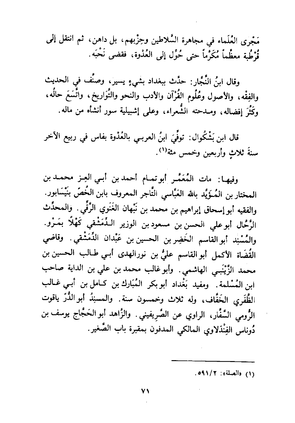 وقال ابنُ النَّجَّار: حدَّث ببغداد بشيءٍ يسير، وصنَّف في الحديث والفِقْه، والأصول وعُلُوم القُرْآن والأدب والنحو والتَّوَاريخ، واتَّسَعَ حالُه، وكَثُرَ إفضاله، ومدحته الشُّعراء، وعلى إشبيلية سور أنشأه من ماله.