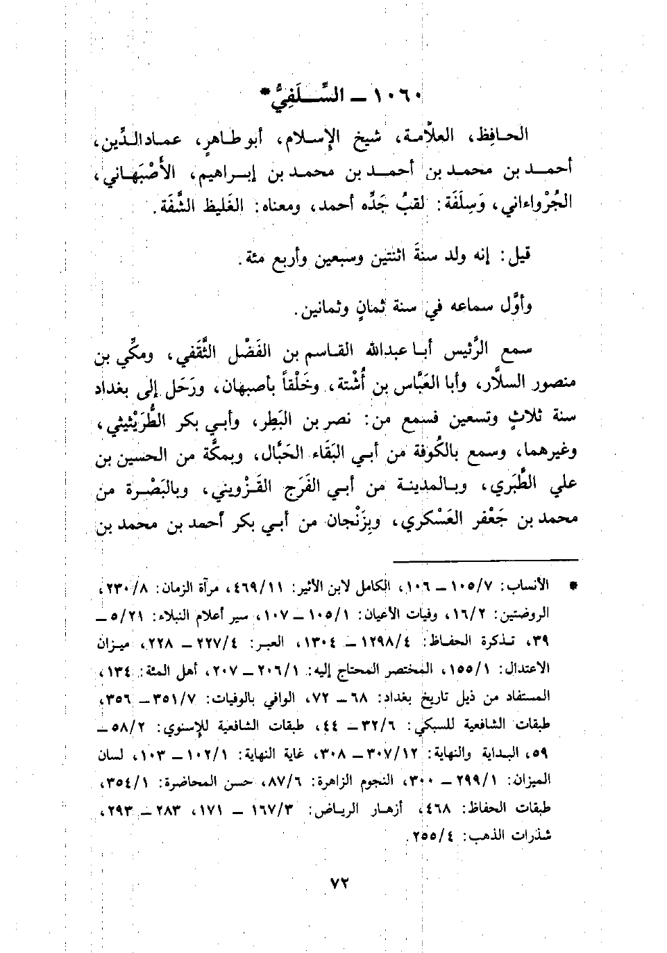 الحافِظ، العلَّامة، شيخ الإسلام، أبو طاهرٍ، عماد الدِّين، أحمد بن محمد بن أحمد بن محمد بن إبراهيم، الأصْبَهاني، الجُرْواءاني، وَسِلَفَة: لقبُ جَدِّه أحمد، ومعناه: الغَليظ الشَّفَة.