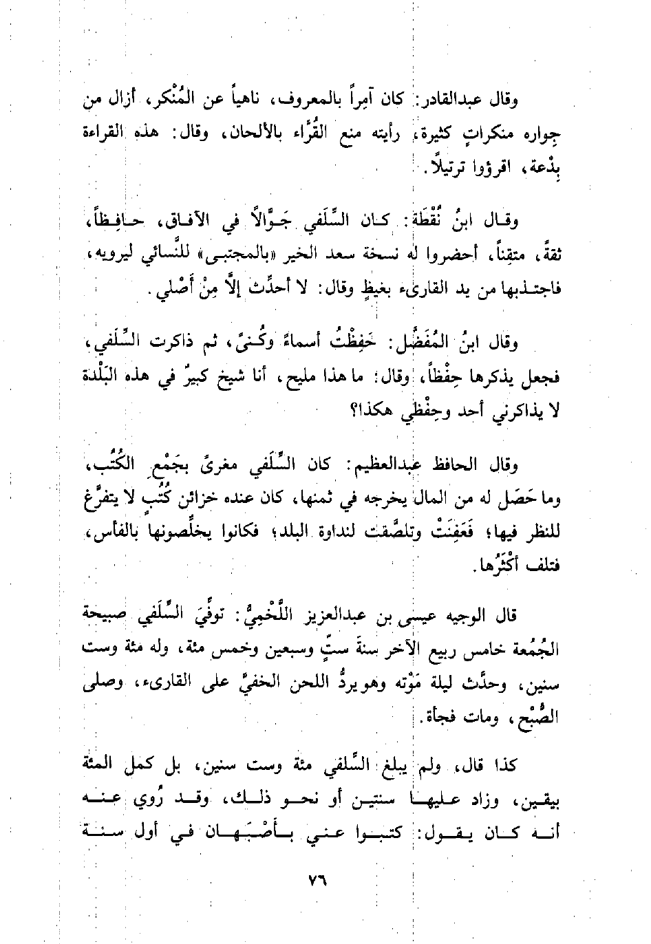 وقال ابنُ نُقْطَة: كان السِّلَفي جَوَّالًا في الآفاق، حافِظًا، ثقةً، متقِنًا، أحضروا له نسخة سعد الخير "بالمجتبى" للنَّسائي ليرويه، فاجتذبها من يد القارئ بغيظٍ وقال: لا أحدِّث إلَّا مِنْ أَصْلي.