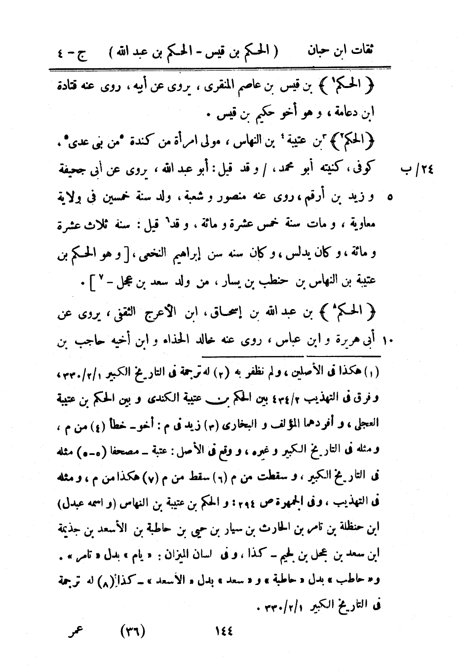 2199 - الحكم بْن عتيبة بْن النهاس مولى امْرَأَة من كِنْدَة من بنى عدى كُوفِي كُنْيَتُهُ أَبُو مُحَمَّد وَقد قيل أَبُو عَبْد اللَّه يروي عَن أبي جُحَيْفَة وَزيد بْن أَرقم روى عَنهُ مَنْصُور وَشعْبَة ولد سنة خمسين فِي ولَايَة مُعَاوِيَة وَمَات سنة خمس عشرَة وَمِائَة وَقد قيل سنة ثَلَاث عشرَة وَمِائَة وَكَانَ يُدَلس وَكَانَ سنه سنّ إِبْرَاهِيم النَّخعِيّ وَهُوَ الحكم بن عتيبة بن النهاس بن حنْطَب بن يسَار من ولد سعد بن عجل