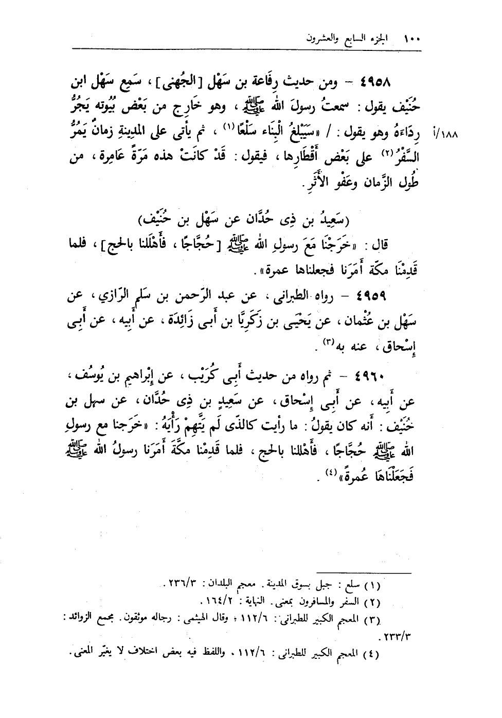 4959 - رواه الطبرانى، عن عبد الرحمن بن سلم الرازى، عن سهل بن عثمان، عن يحيى بن زكريا بن أبى زائدة، عن أبيه، عن أبى إسحاق، عنه به (¬3) .
