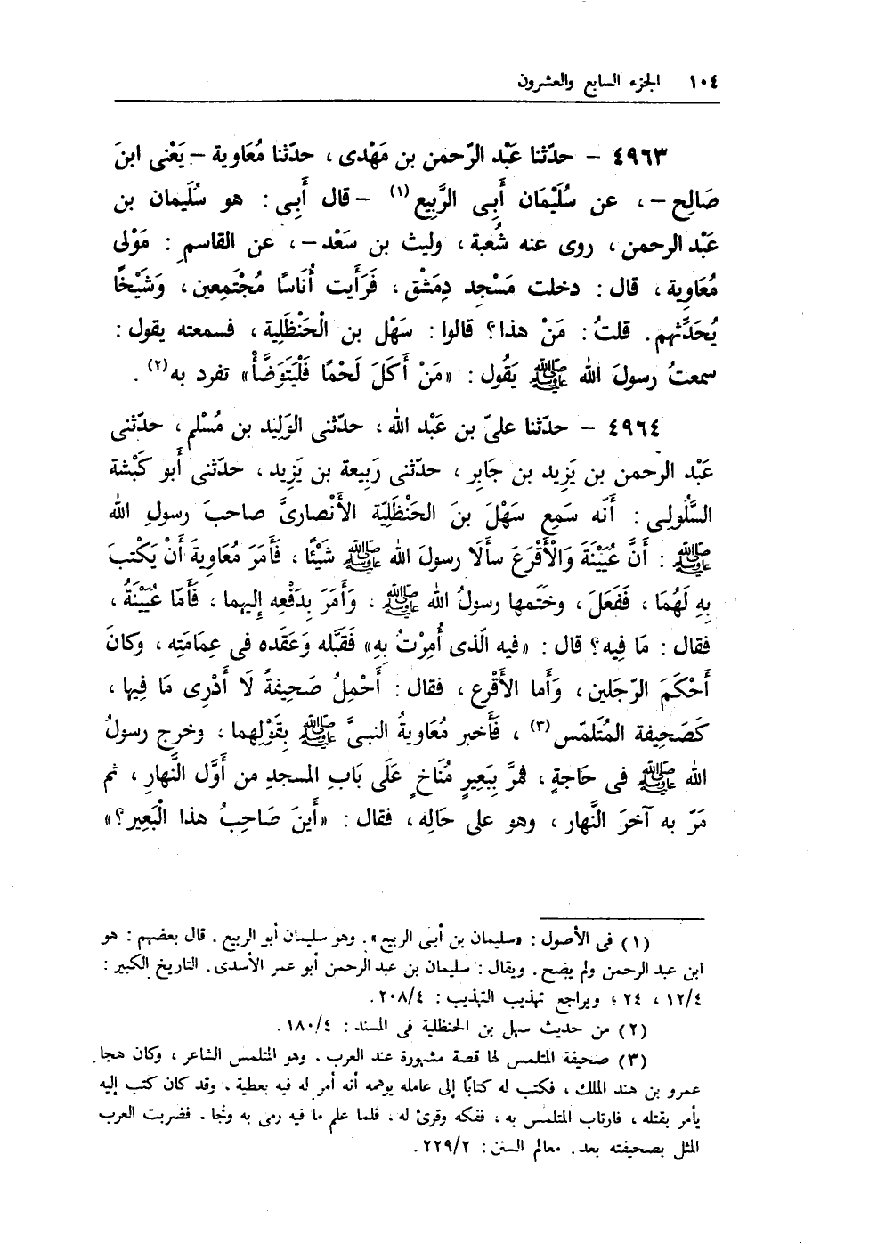 4964 - حدثنا على بن عبد الله، حدثنى الوليد بن مسلم، حدثنى عبد الرحمن بن يزيد، حدثنى أبو كبشة السلولى: أنه سمع سهل بن الحنظلية الأنصارى صاحب رسول الله - صلى الله عليه وسلم -: أن عيينة والأقرع سألا رسول الله - صلى الله عليه وسلم - شيئًا، فأمر معاوية أن يكتب به لهما، ففعل، وختمها رسول الله - صلى الله عليه وسلم -، وأمر بدفعه إليهما، فأمر عيينة، فقال: ما فيه؟ قال: «فيه الذى أمرت به» فقبله وعقده في عمامته، وكان أحكم الرجلين، وأما الأقرع، فقال: أحمل صحيفة لا أدرى ما فيها، كصحيفة المتلمس (¬3) ، فأخبر معاوية النبى - صلى الله عليه وسلم - بقولهما، وخرج رسول الله - صلى الله عليه وسلم - في حاجة، فمر ببعير مناخٍ على باب المسجد من أول النهار، ثم مر به آخر النهار، وهو على حالة، فقال: «أين صاحب هذا البعير؟»