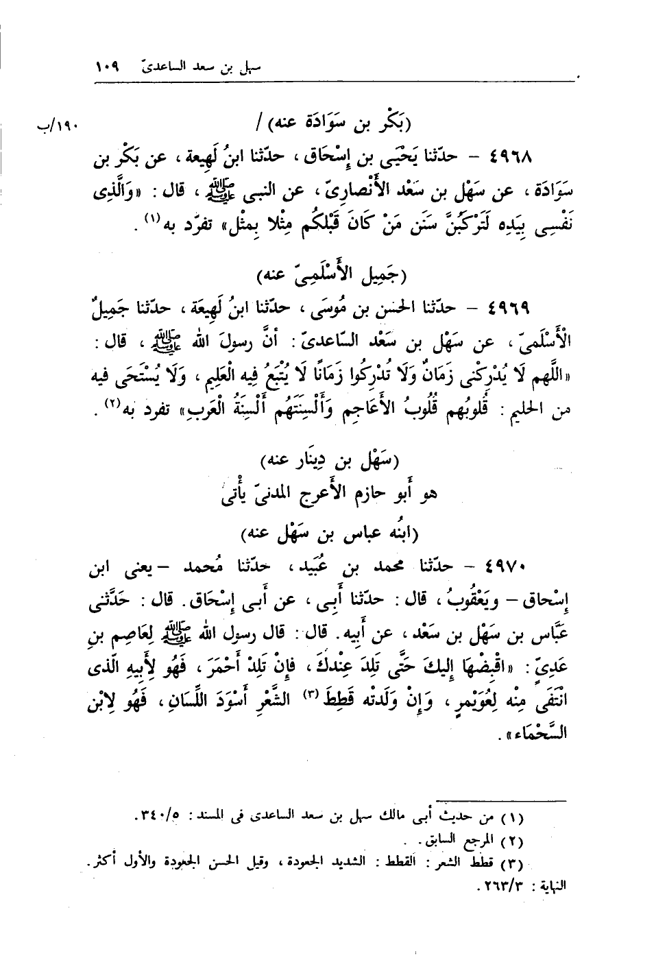 4969 - حدثنا الحسن بن موسى، حدثنا ابن لهيعة، حدثنا جميل الأسلمى، عن سهل بن سعد الساعدى: أن رسول الله - صلى الله عليه وسلم -، قال: «الَّلهُم لا يُدْرِكْنى زَمَانٌ ولا تُدْرِكوا زمَانًا لا يُتْبَعُ فيه العَلِيم، ولا يُسْتَحَى فيه من الحليم: قُلُوبهم قُلُوب الأعَاجِم وألْسِنَتَهُم ألْسِنَةُ العَرَبِ» تفرد به (¬2) .
