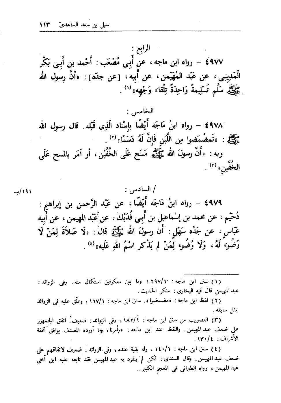 4979 - رواه ابن ماجه أيضًا، عن عبد الرحمن بن إبراهيم: دحيم: عن محمد ابن إسماعيل بن أبى فديك، عن عبد المهيمن، عن أبيه عباس، عن جده سهل: أن رسول الله - صلى الله عليه وسلم - قال: «لا صَلاةَ لِمَنْ لا وُضُوءَ لَهُ، ولا وُضوءَ لمنْ لم يَذْكر اسمُ اللهِ عليه» (¬4) .