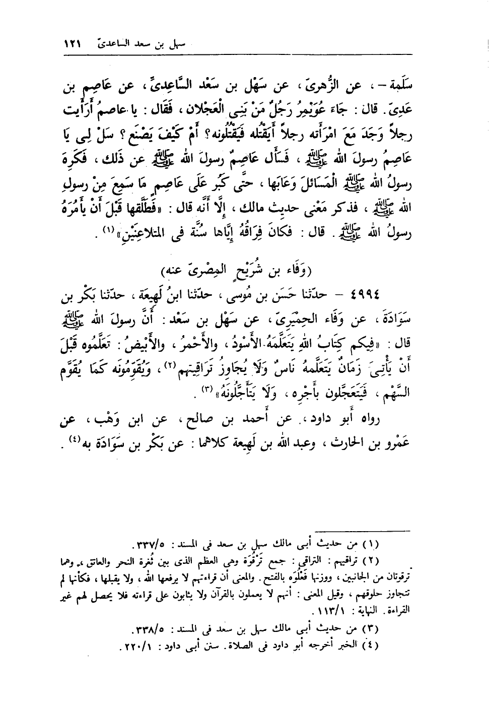 4994 - حدثنا حسن بن موسى، حدثنا ابن لهيعة، حدثنا بكر بن سوادة، عن وفاء الحميرى، عن سهل بن سعد: أن رسول الله - صلى الله عليه وسلم - قال: «فِيكُم كِتَابُ اللهِ يَتَعَلَّمهُ الأسود، والأحمر، والأبيض: تعلموه قبل أن يأتى زمان يتعلمه نَاسٌ ولا يُجَاوِزَ تَرَاقِيتهم (¬1) ، ويُقَوِّمُونه كَمَا يُقوَّم السَّهم، فَيَتَعَجَّلون بأجرِه، ولا يتأجَّلُونَه» (¬2) .
