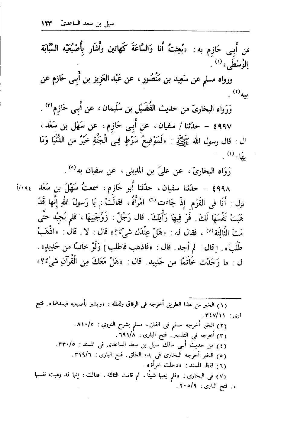 4997 - حدثنا / سفيان، عن أبى حازم، عن سهل بن سعد، قال: قال رسول الله - صلى الله عليه وسلم -: «لَمَوْضِعُ سَوْطٍ في الجنَّةِ خَيْرٌ من الدُّنْيَا ومَا بِهًا» (¬1) .