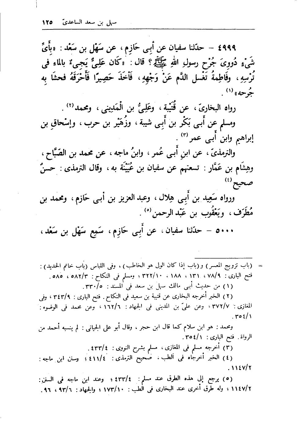 4999 - حدثنا سفيان عن أبى حازم، عن سهل بن سعد: «بأى شىء دووى جرح رسول الله - صلى الله عليه وسلم -؟ قال: «كان علىّ يجىء بالماء في تُرسه، وفاطمة تغسل الدم عن وجهه، فأخذ حصيرًا فأحرقه فحشا به جرحه» (¬1) .