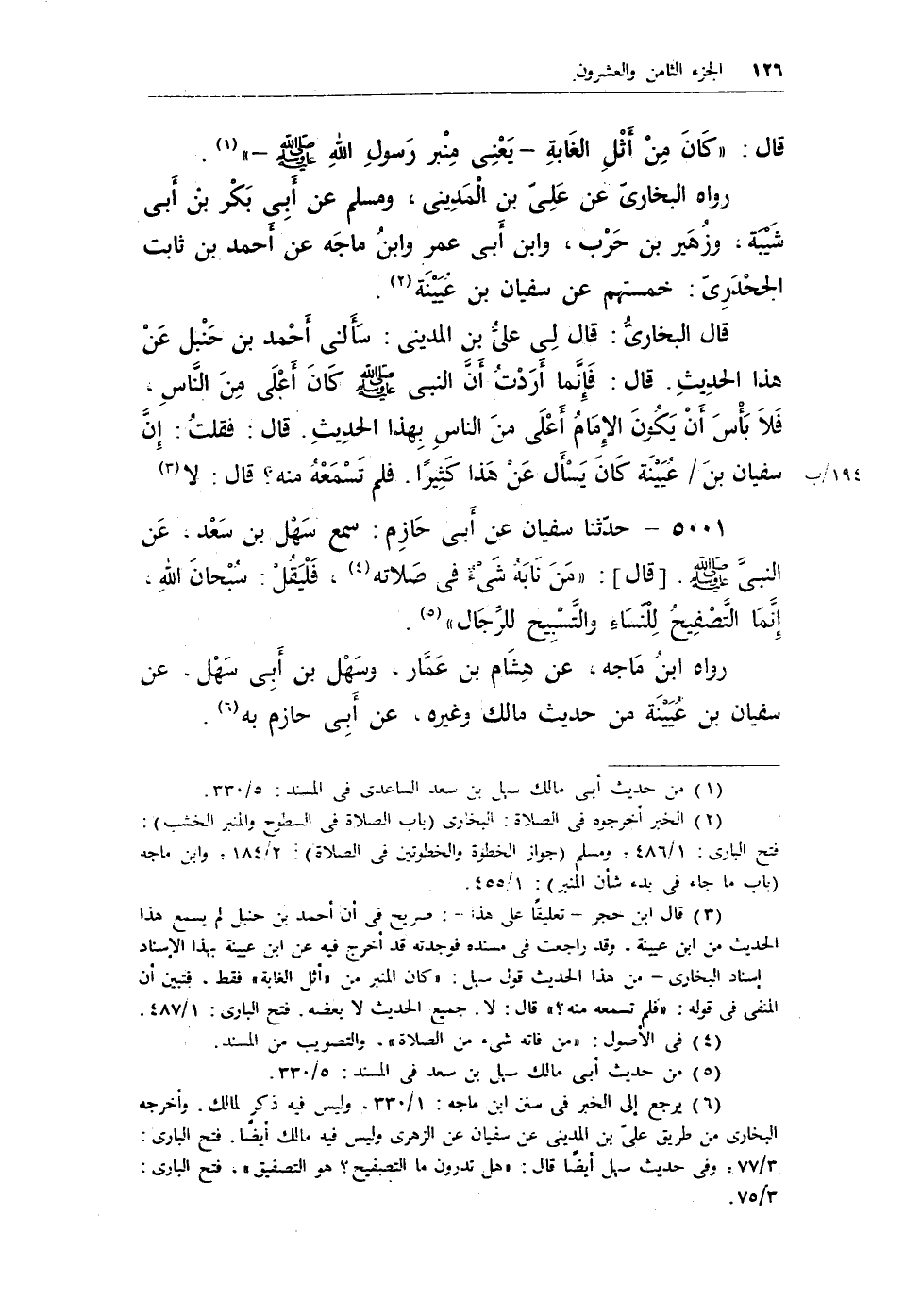 (¬3) قال ابن حجر - تعليقًا على هذا -: صريح في أن أحمد بن حنبل لم يسمع هذا الحديث من ابن عيينة، وقد راجعت في مسنده فوجدته فد أخرج فيه عن ابن عيينة بهذا الإسناد إسناد البخارى - من هذا الحديث قول سهل: «كان المنبر من أثل الغابة فق، فتبين أن المنفى في قوله: «فلم تسمعه منه؟» قال: لا. جميع الحديث لا بعضه. فتح البارى: 1/487.