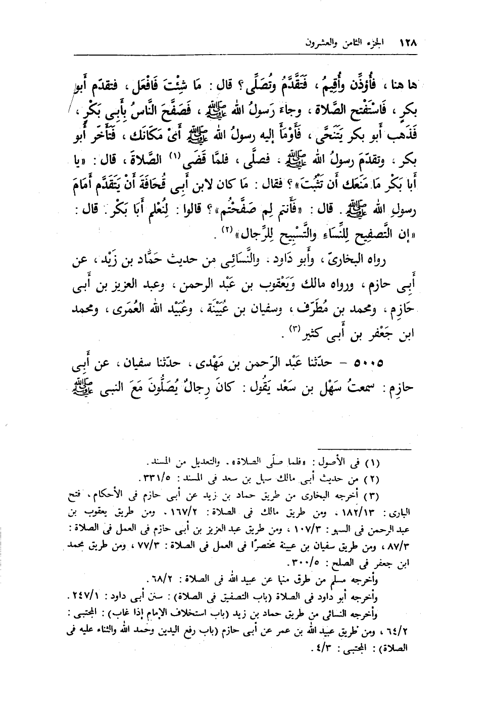 = ... وأخرجه أبو داود في الصلاة (باب التصفيق في الصلاة) : سنن أبى داود: 1/ 247. وأخرجه النسائى من طريق حماد بن زيد (باب استخلاف الإمام إذا غاب) : المجتبى: 2/ 64، ومن طريق عبيد الله بن عمر عن أبى حازم (باب رفع اليدين وحمد الله والثناء عليه في الصلاة) : المجتبى: 3/4.