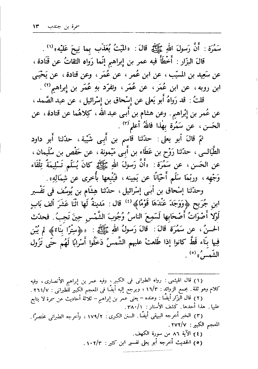 قلتُ: قد رَواهُ أَبو يَعلى عن إِسْحاق بن إِسْرائيل، عن عبد الصَّمد، عن عُمر بن إِبْراهيم. وعن هشام بن أَبي عبد الله، كِلاهُما عن قتادة، عن الحَسن، عن سَمُرة بِهذا فاللهُ أعلم (¬3) .