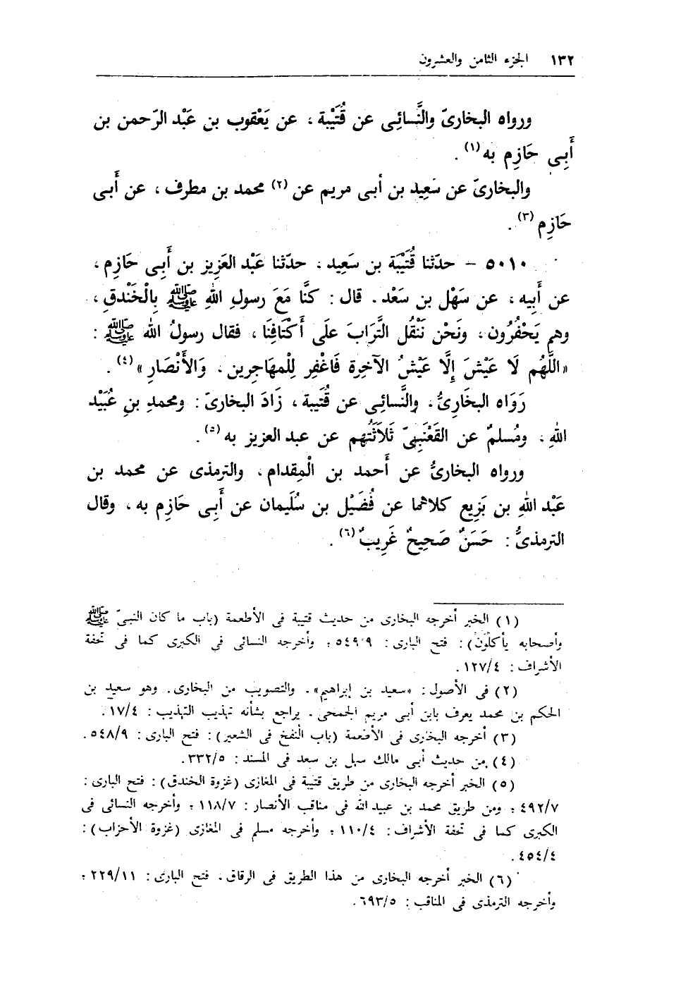 (¬2) الخبر أخرجه البخارى من طريق قتيبة في المغازى (غزوة الخندق) : فتح البارى: 7/ 492؛ ومن طريق محمد بن عبيد الله في مناقب الأنصار: 7/ 118؛ وأخرجه النسائى في الكبرى كما في تحفة الأشراف: 4/ 110؛ وأخرجه مسلم في المغازى (غزوة الأحزاب) : 4/ 454.