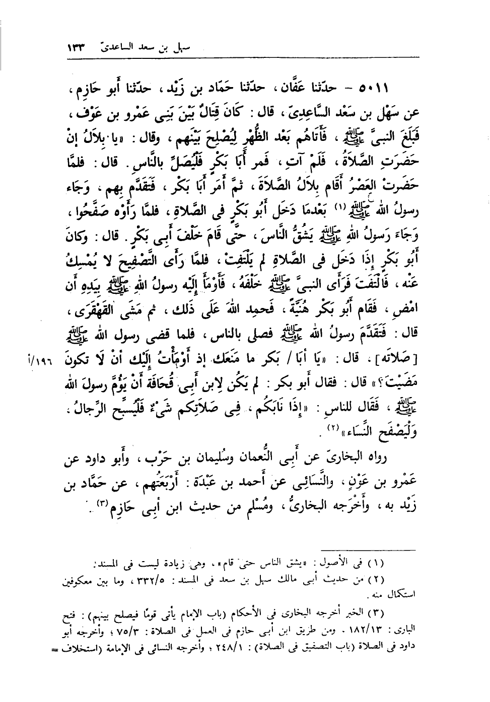 (¬3) الخبر أخرجه البخارى في الأحكام (باب الإمام يأتى قومًا فيصلح بينهم) : فتح البارى: 13/ 182، ومن طريق ابن أبى حازم في العمل في الصلاة: 3/ 75؛ وأخرجه أبو داود في الصلاة (باب التصفيق في الصلاة) : 1/ 248؛ وأخرجه النسائى في الإمامة (استخلاف الإمام إذا غاب) : 2/ 64؛ وأخرجه مسلم في الصلاة (بتقديم الجماعة من يصلى بهم إذا تاخر الإمام) مسلم بشرح النووى: 2/ 68.