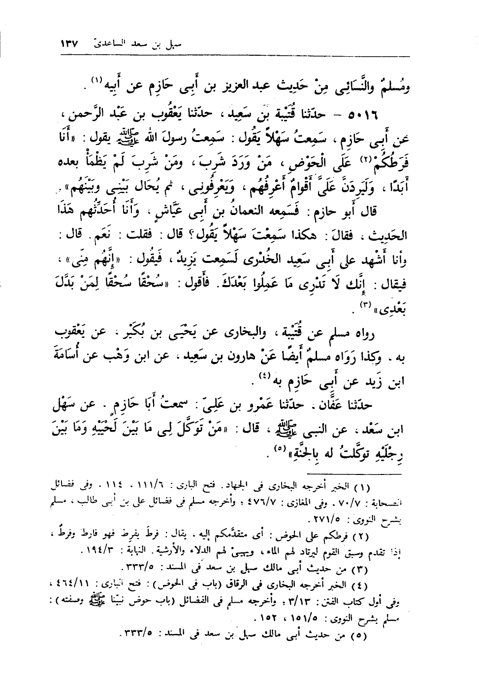 رواه مسلم عن قتيبة والبخارى عن يحيى بنت بكير، عن يعقوب به، وكذا رواه مسلم أيضاً عن هارون بن سعد، عن ابن وهب عن أسامة بن زيد عن أبى حازم به (¬3) .