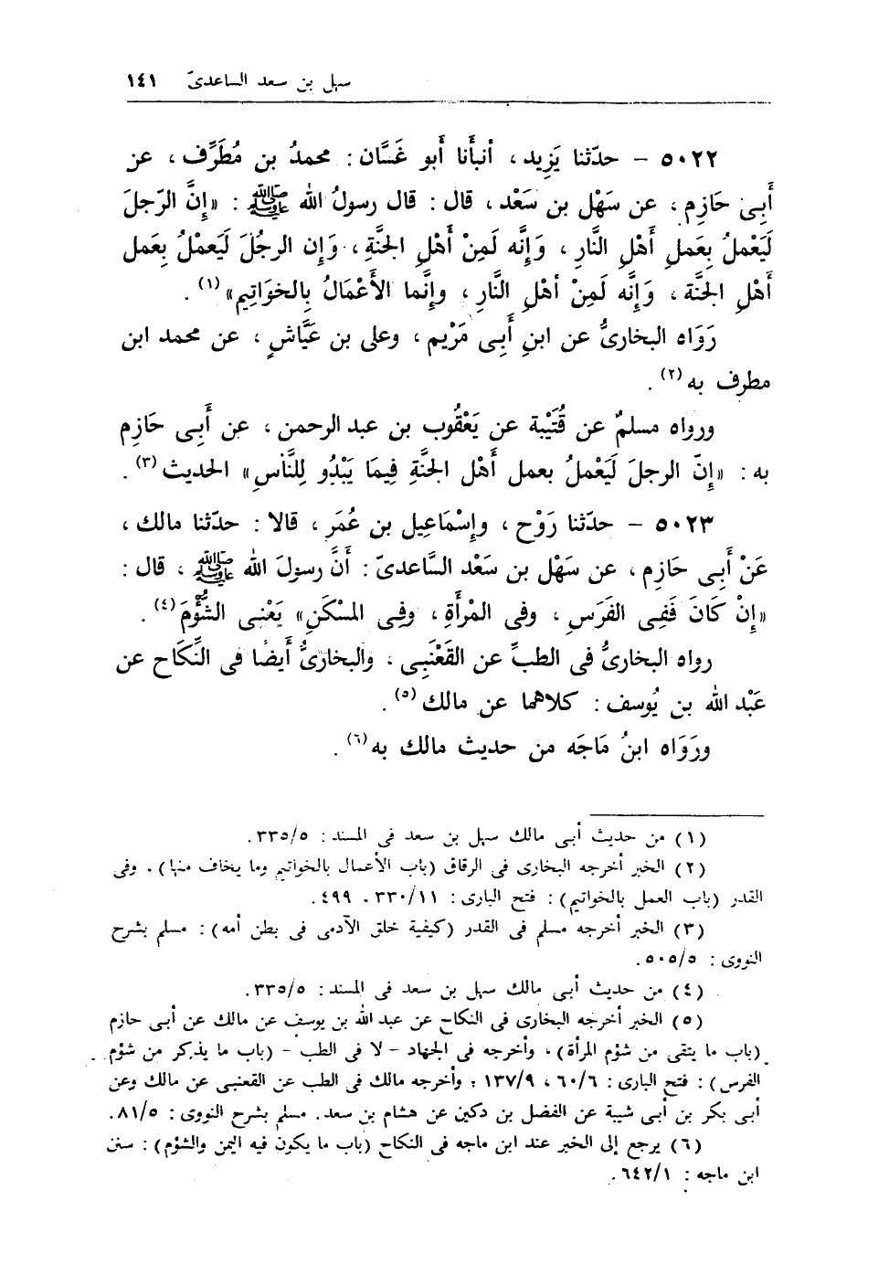 5022 - حدثنا يزيد، أنبأنا أبو غسان: محمد بن مطرف، عن أبى حازم، عن سهل بن سعد، قال: قال رسول الله - صلى الله عليه وسلم -: «إنَّ الرَّجُلَ ليعملُ بعملِ أهلِ النارِ، وإنَّه لمنْ أهلِ الجنَّة، وإن الرجلَ ليعملُ بعمل أهلِ الجنَّة، وإنه لمنْ أهلِ النَّار، وإنَّمَا الأعمالُ بالخواتيم» (¬1) .