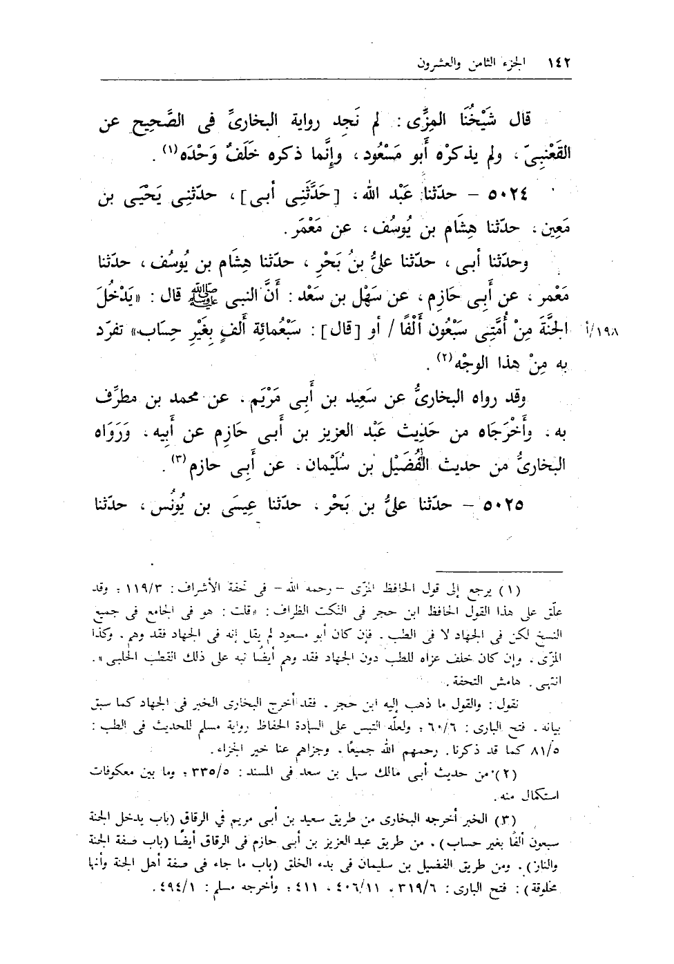 (¬2) الخبر أخرجه البخارى من طريق سعيد بن أبى مريم في الرقاق (باب يدخل الجنة سبعون ألفا بغير حساب) ، من طريق عبد العزيز بن أبى حازم في الرقاق أيضًا (باب صفة الجنة والنار) ، ومن طريق الفضيل بن سليمان في بدء الخلق (باب ما جاء في صفة أهل الجنة وأنها مخلوقة) : فتح البارى: