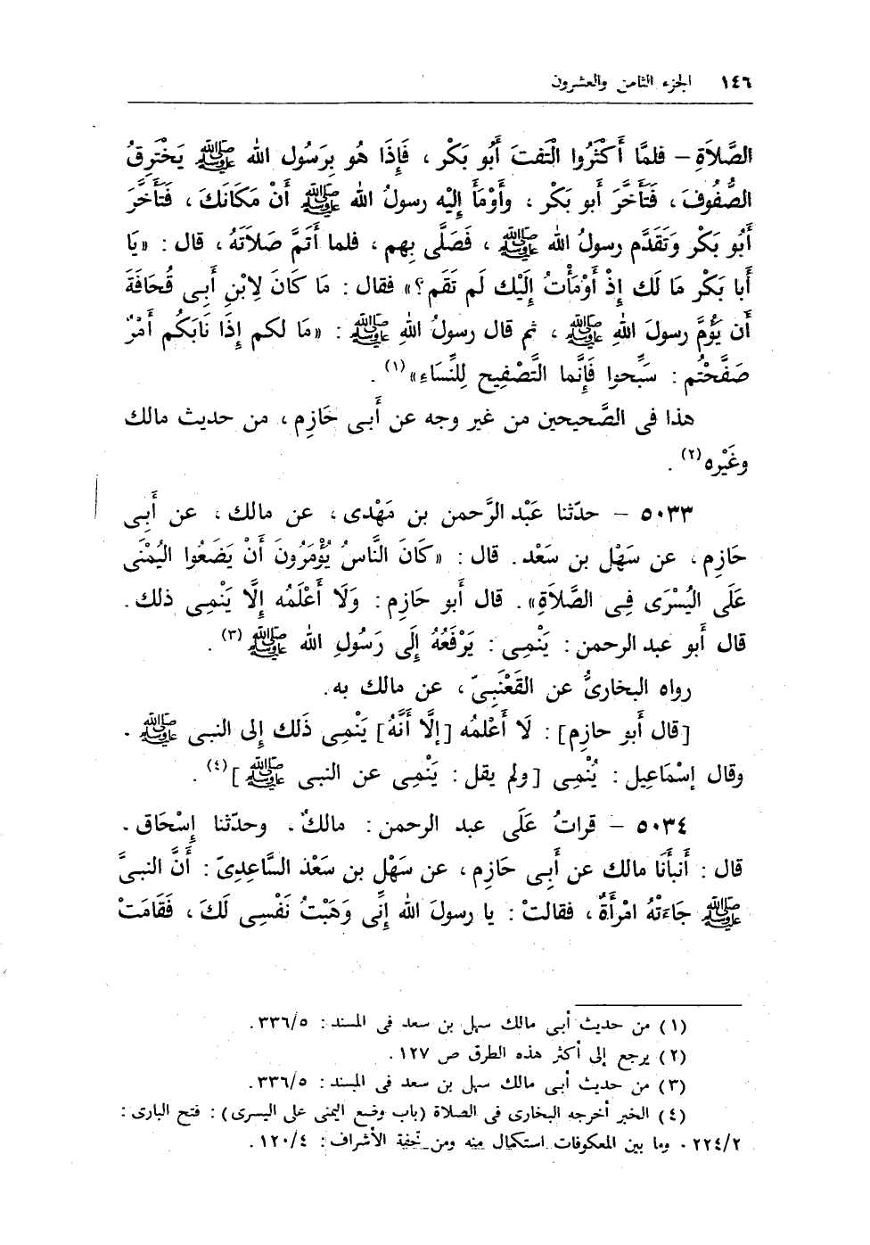 5033 - حدثنا عبد الرحمن بن مهدى، عن مالك، عن ابى حازم، عن سهل ابن سعد. قال: «كان الناس يُؤمرون أن يضعوا اليمنى على اليسرى في الصلاة» . قال أبو حازم: ولا أعلمه إلا ينمى ذلك. قال أبو عبد الرحمن: ينمى: يرفعه إلى رسول الله - صلى الله عليه وسلم -. (¬1) .
