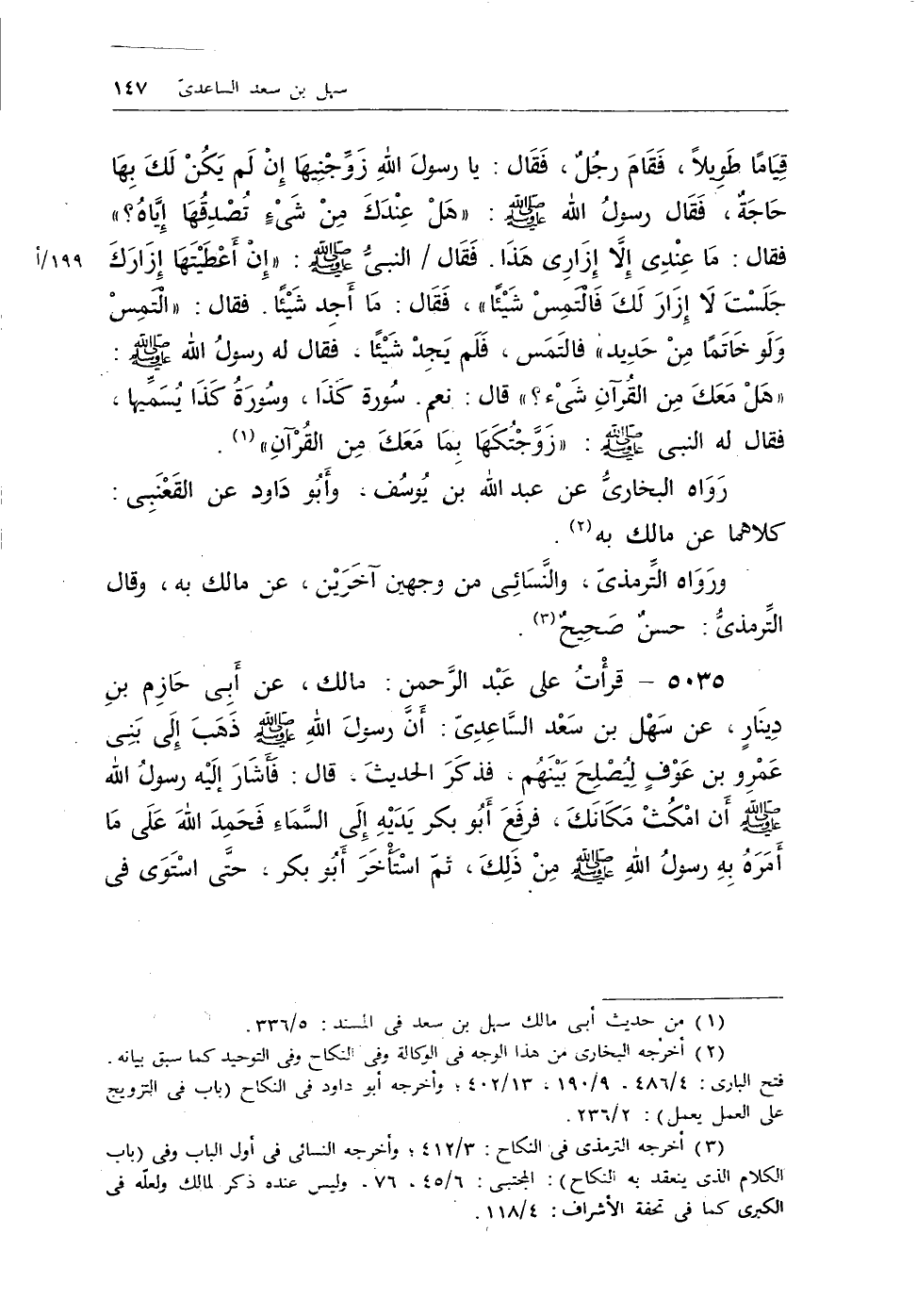 (¬3) أخرجه الترمذى في النكاح: 3/ 412؛ وأخرجه النسائى في أول الباب وفى (باب الكلام الذى ينعقد به النكاح) : المجتبى: 6/ 45، 76، وليس عنده ذكر لمالك ولعله في الكبرى كما في تحفة الأشراف: 4/ 118.