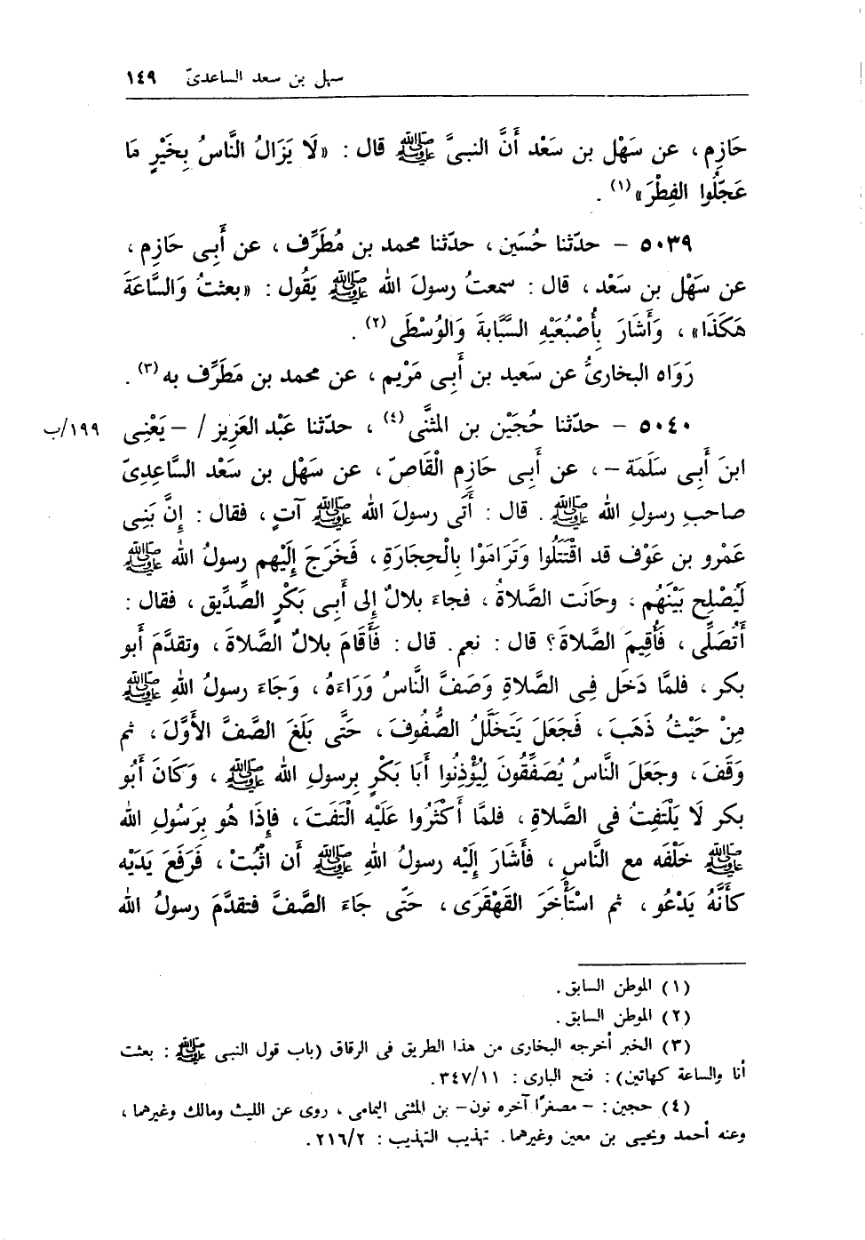 5040 - حدثنا حجين بن المثنى (¬3) ، حدثنا عبد العزيز / - يعنى ابن أبى سَلَمة -، عن أبى حازم القاص، عن سهل بن سعد الساعدى صاحب رسول الله - صلى الله عليه وسلم -. قال: أتى رسول الله - صلى الله عليه وسلم - آتٍ، فقال: إن بنى عمرو بن عوف قد اقتتلوا وتراموا بالحجارة، فخرج إليهم رسول الله - صلى الله عليه وسلم - ليصلح بينهم، وحانت الصلاة، فجاء بلال إلى ابى بكر الصديق، فقال: أتصلى، فأقيم الصلاة؟ قال: نعم. قال: فأقام بلال الصلاة، وتقدم أبو بكر، فلما دخل في الصلاة وصف الناس وراءه، وجاء رسول الله - صلى الله عليه وسلم - من حيث ذهب، فجعل يتخلل الصفوف، حتى بلغ الصف الأول، ثم وقف، وجعل الناس يصفقون ليؤذنوا أبا بكر برسول الله - صلى الله عليه وسلم -، وكان أبو بكر لا يلتفت في الصلاة، فلما أكثروا عليه التفت، فإذا هو برسول الله - صلى الله عليه وسلم - خلفه مع الناس، فأشار إليه رسول الله - صلى الله عليه وسلم - أن اثبت، فرفع يديه كأنه يدعو، ثم استأخر القهقرى، حتى جاء الصف فتقدم رسول الله