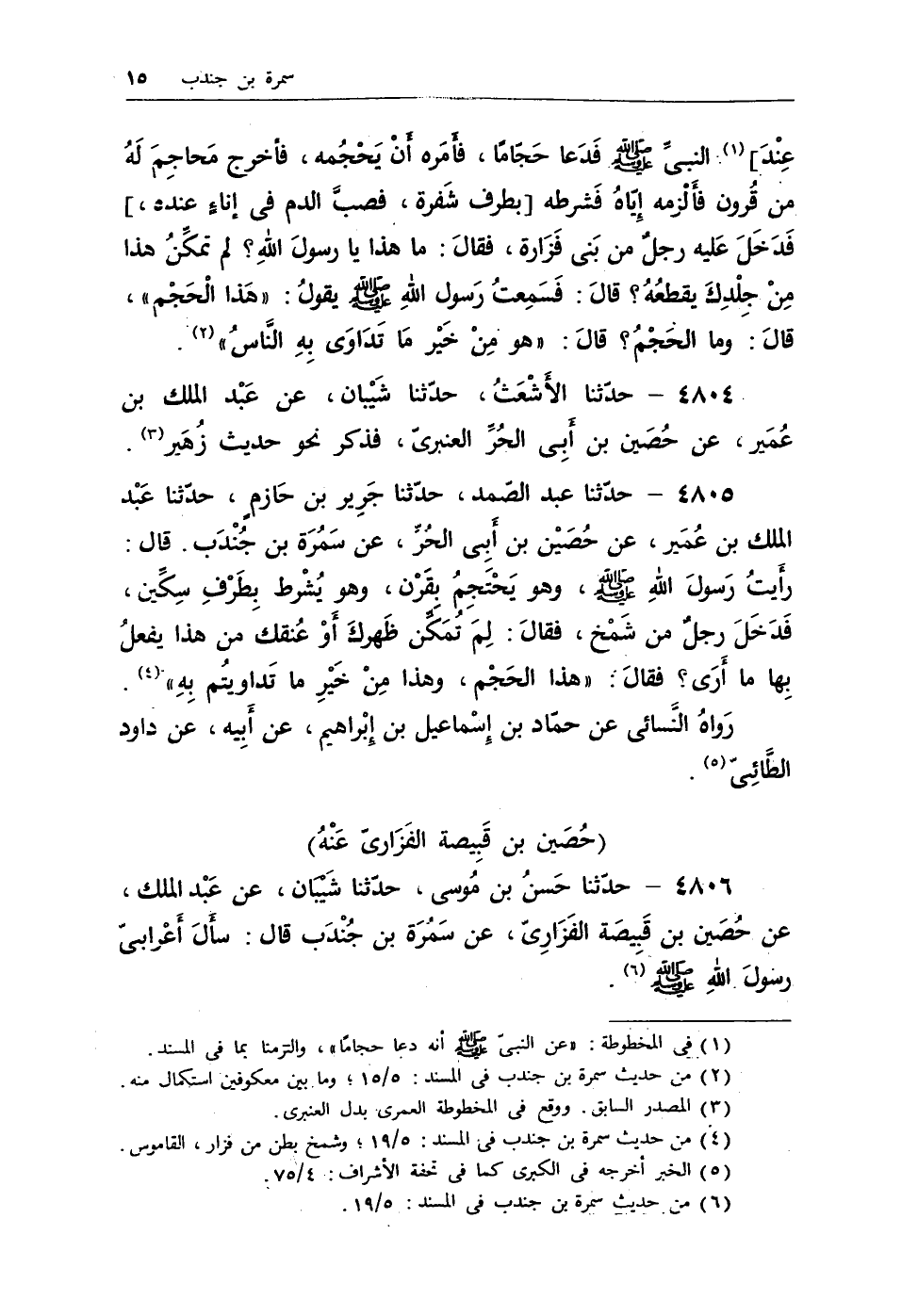 4806- حدّثنا حَسنُ بن مُوسى، حدّثنا شَيْبَان، عن عَبْد الملك، عن حُصَين بن قَبِيصَة الفَزَارِيّ، عن سَمُرَة بن جُنْدَب قال: سأَلَ أَعْرابيّ رسولَ اللهِ - صلى الله عليه وسلم - (¬6) .