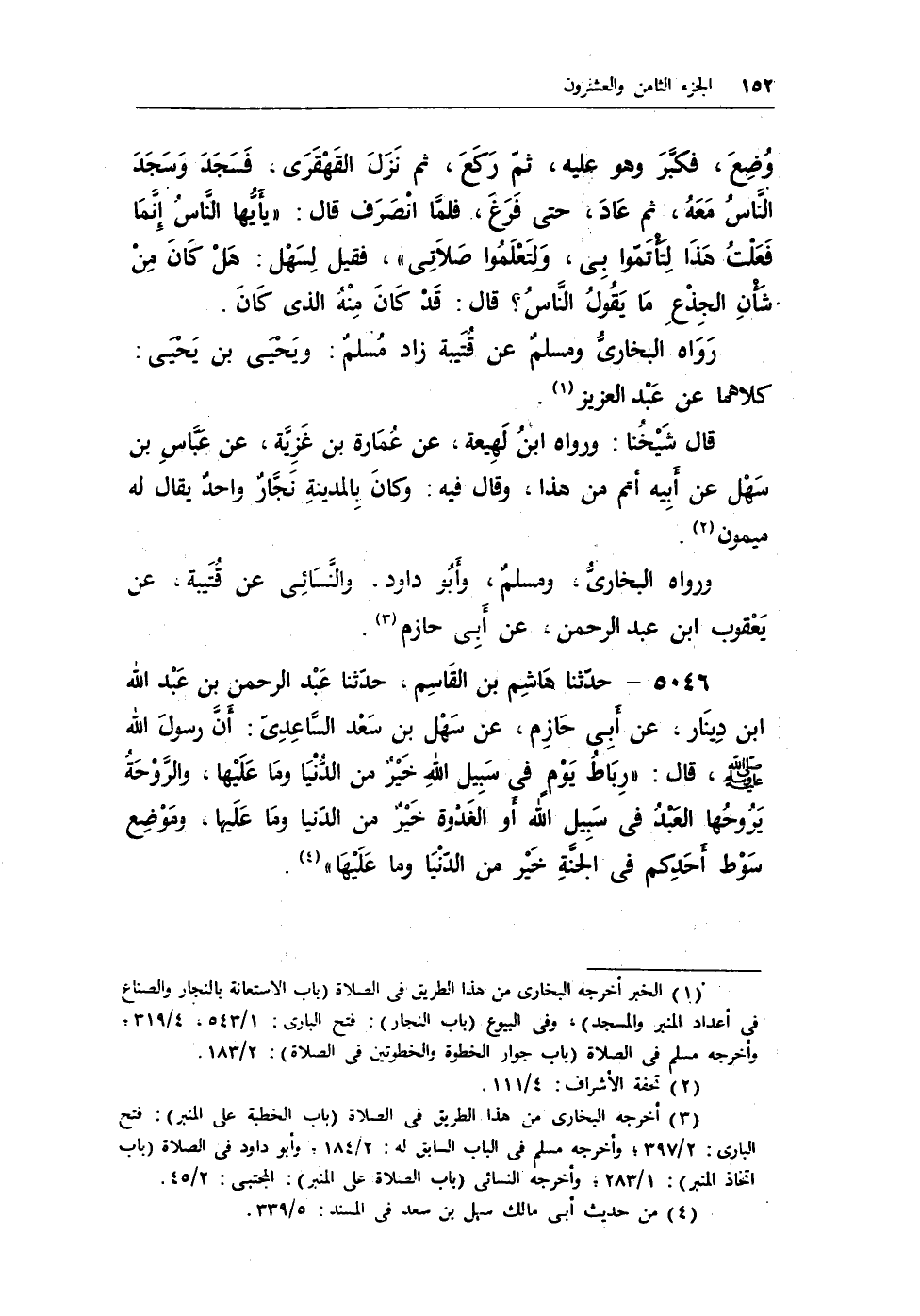 (¬1) الخبر أخرجه البخارى من هذا الطريق في الصلاة (باب الاستعانة بالنجار والصناع في أعداد المنبر والمسجد) ، وفى البيوع (باب النجار) : فتح البارى: 1/ 543، 4/ 319؛ وأخرجه مسلم في الصلاة (باب جوار الخطوة والخطوتين في الصلاة) : 2/ 183.