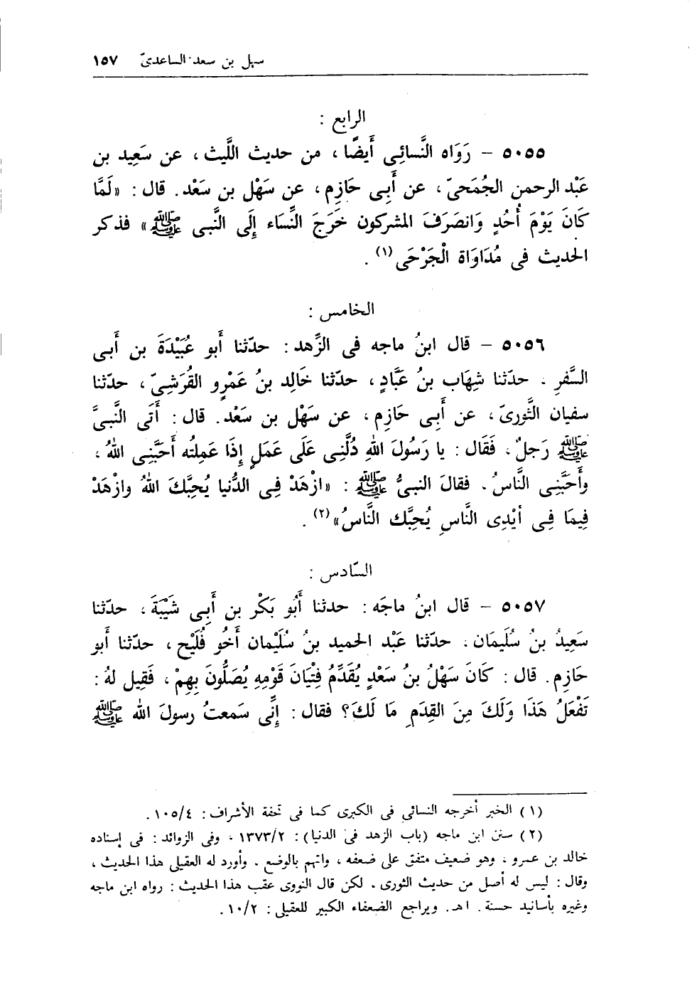 5056 - قال ابن ماجه في الزهد: حدثنا أبو عبيدة بن أبى السفر، حدثنا شهاب بن عباد، حدثنا خالد بن عمرو القرشى، حدثنا سفيان الثورى، عن ابى حازم، عن سهل بن سعد، قال: أتى النبى - صلى الله عليه وسلم - رجلٌ، فقال: يا رسول الله دُلنى على عملٍ إذا عملته أحبَّنى الله، وأحبَّنى الناس، فقال النبى - صلى الله عليه وسلم -: «ازْهَدْ في الدُّنْيَا يُحِبَّكَ اللهُ وازْهَدْ فيما في أيْدِى النَّاسِ يُحِبَّكَ النَّاسُ» (¬2) .